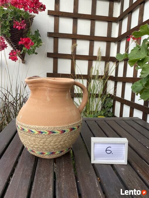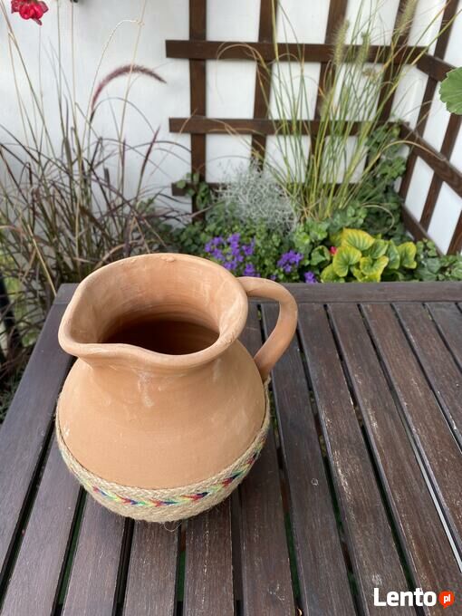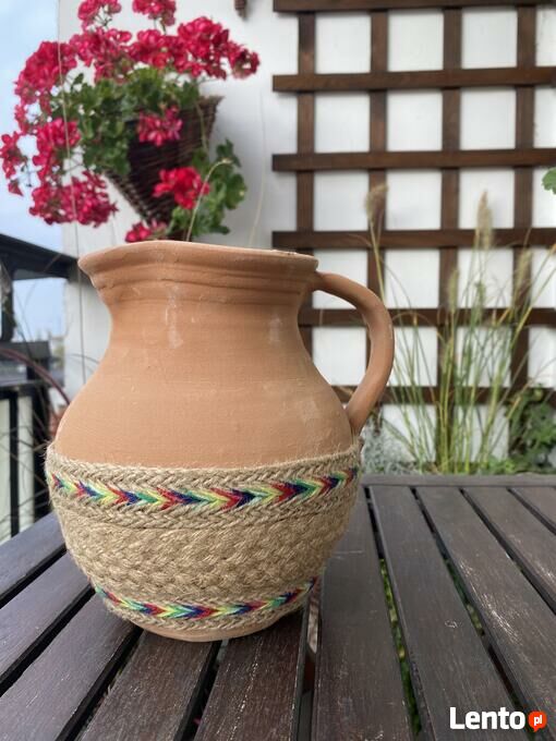 Ręcznie robiony dzbanek gliniany / nieszkliwiony/ zdobiony jutą. Dzbanek wykonany jest z naturalnej gliny.Wysokość 20,5 cm