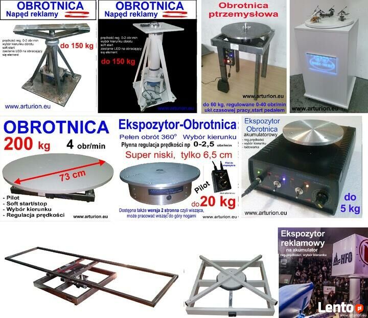 WYKONUJEMY URZĄDZENIA NA ZAMÓWIENIE np ekspozytory - obrotnice z napędem, dowolne obciążenia, kształty, prędkości,wymiary, kolory, dodatkowe funkcje, wersje z niepełnym obrotem - ruch wahadłowy, funkcją zatrzymania co np 10 stopni, złącza umożliwiające podłączenie do sieci 230 v lub 12 v obracające się urządzenie bez obawy ukręcenia przewodów, mechanizmy napędu dużych reklam, mechanizmy zarówno obrotowe jak i liniowe a także mini wyciągarki reklamowe podnoszące reklamy nad wystawą, obrotnice wiszące-sufitowe, sterowniki czasowe, czujniki ruchu, piloty bezprzewodowe,mechanizmy ożywiające witryny sklepowe i wystawowe.