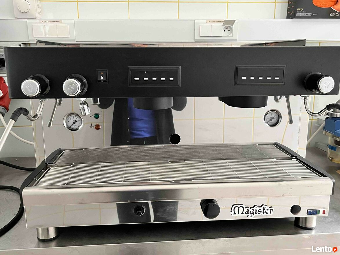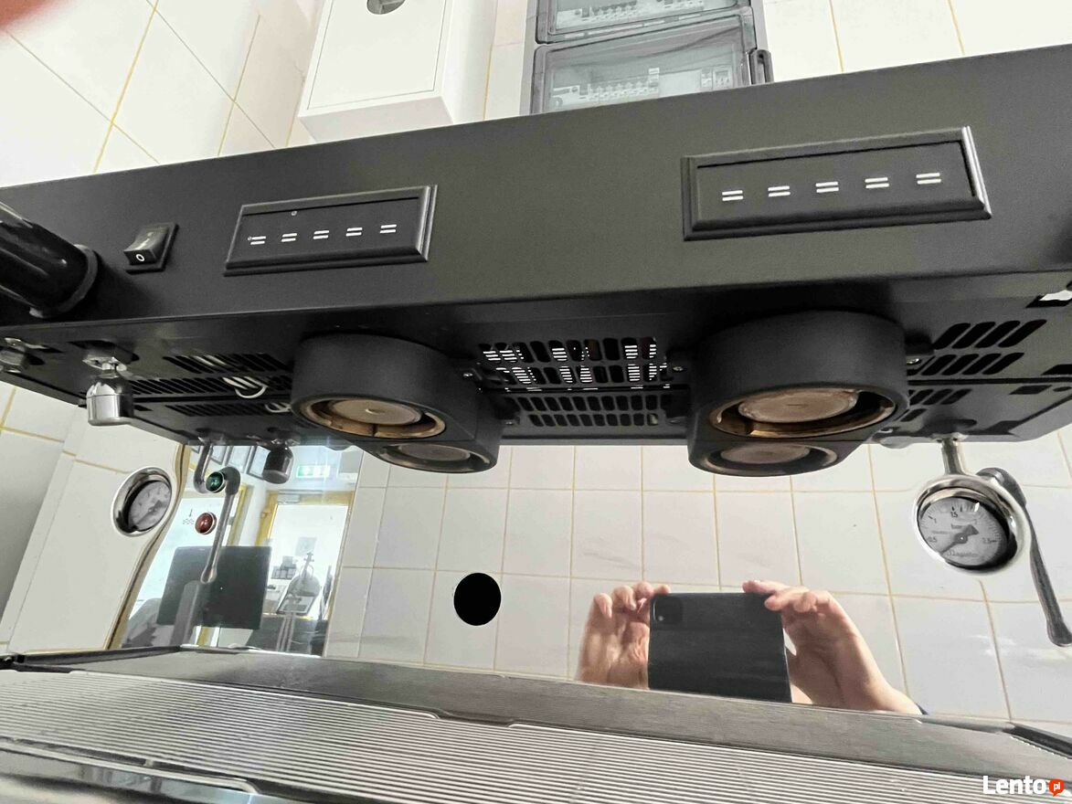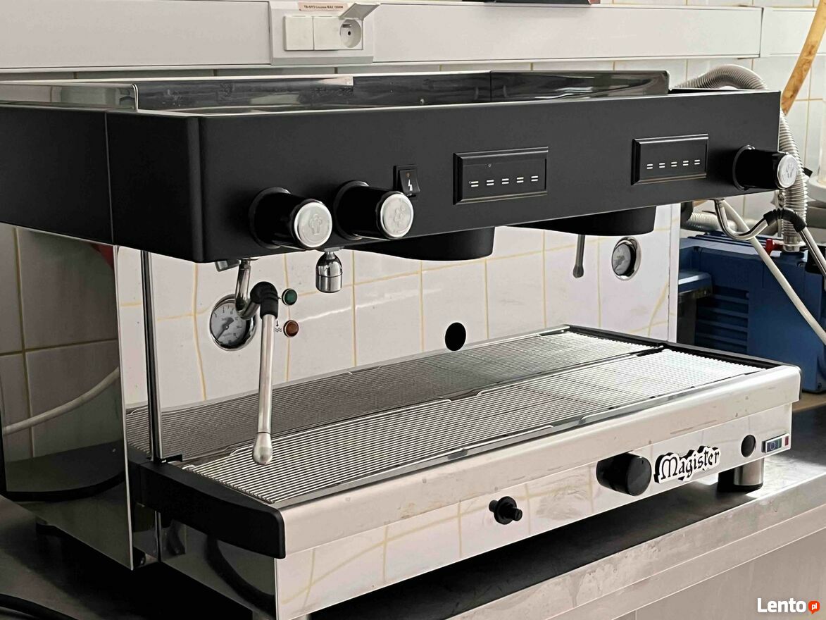 Powystawowy ekspres dwugrupowy z filtrem wody, naczyniami do spieniania mleka, odbijakiem, temperem i młynkiem do kawy w komplecie.Cena nowego zestawu 18000 zł brutto minus rabat 6000 zł = 12000 brutto