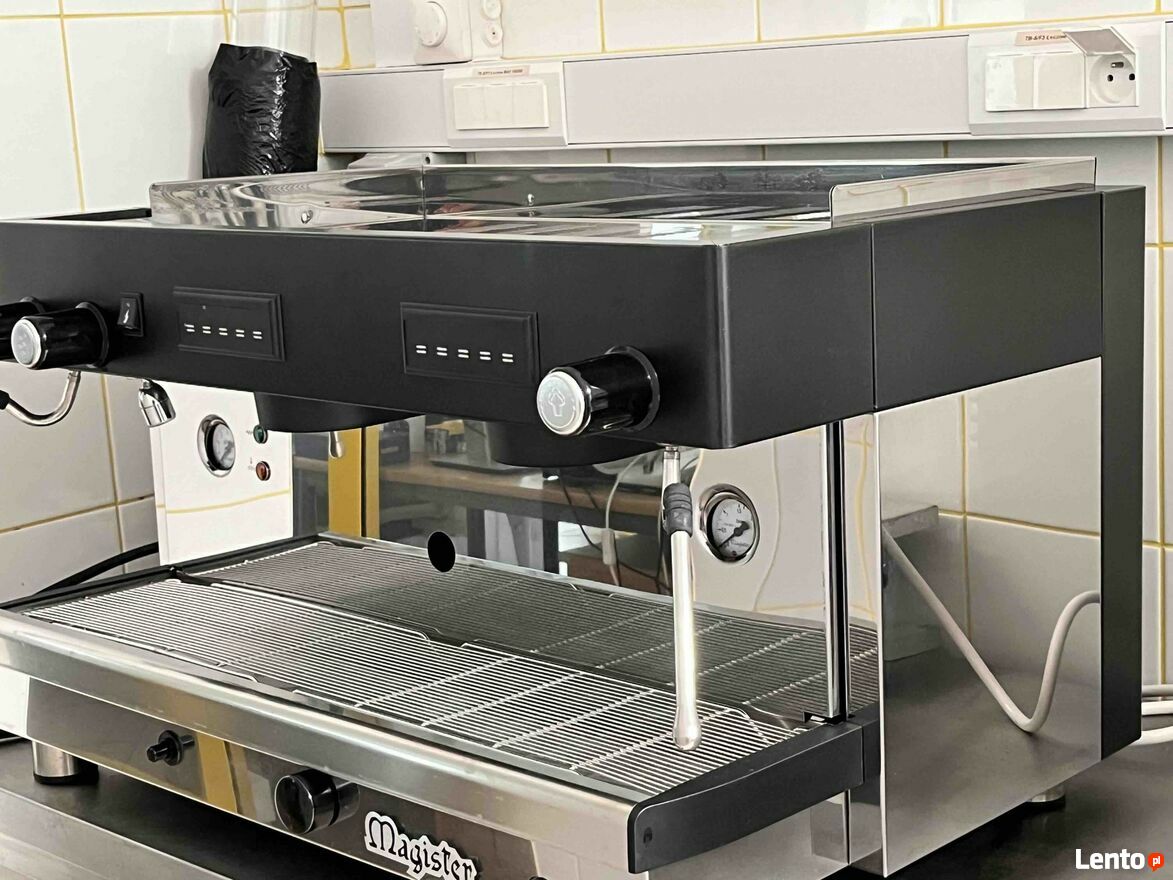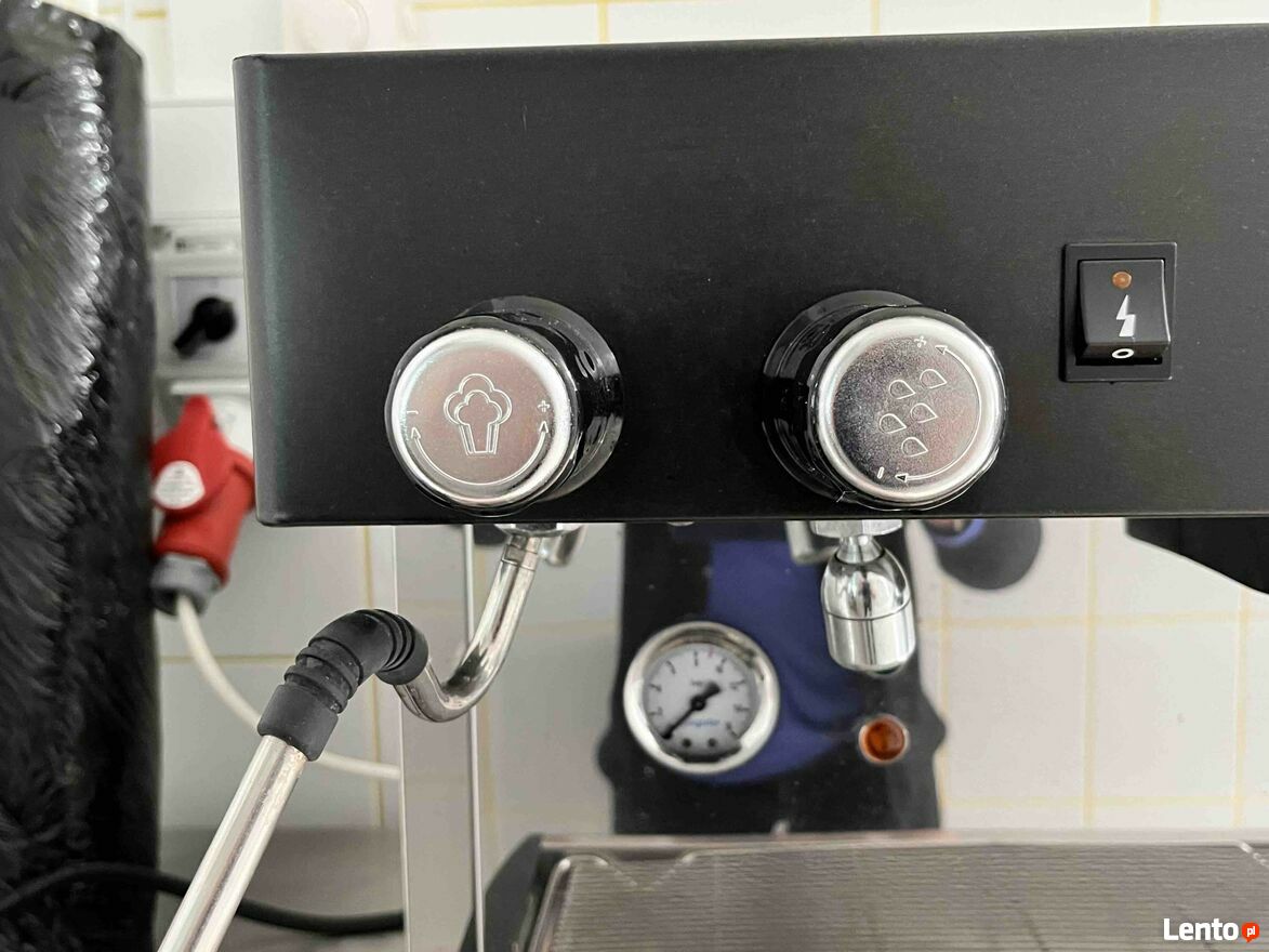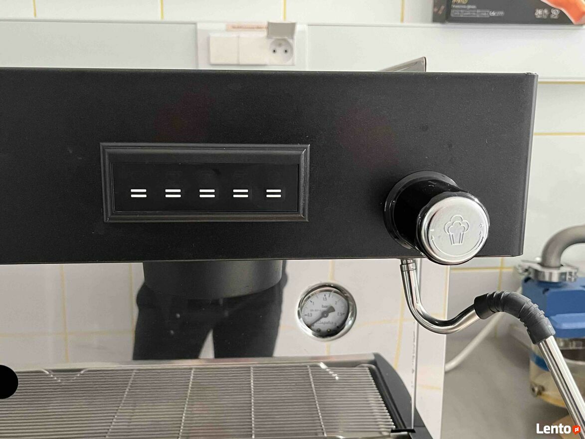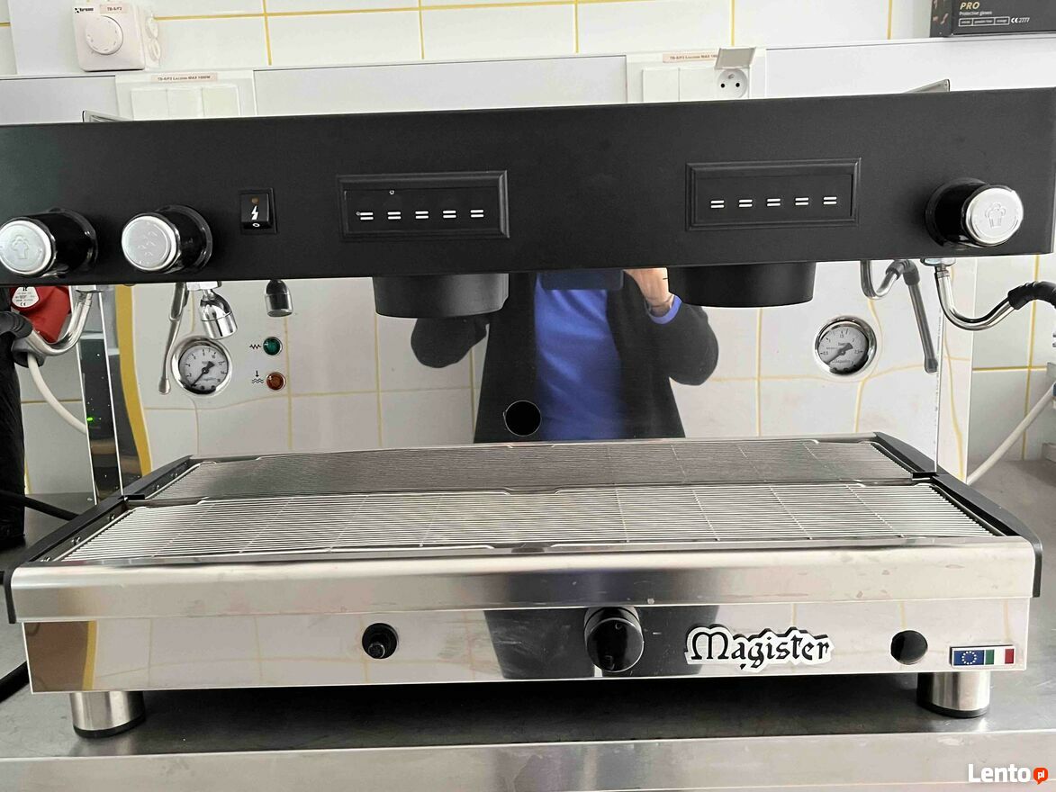 Powystawowy ekspres dwugrupowy z filtrem wody, naczyniami do spieniania mleka, odbijakiem, temperem i młynkiem do kawy w komplecie.Cena nowego zestawu 18000 zł brutto minus rabat 6000 zł = 12000 brutto