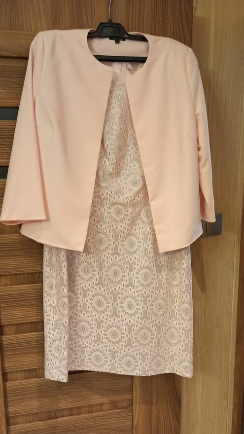 Elegancka sukienka wizytowa blady róż, połyskująca (na zdjęciach tego nie widać) z narzutką lub bez. Raz tylko użyta. Rozmiar 42. Odbiór osobisty. Polecam!Mariusz