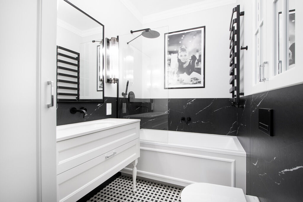 Łazienka: Spektakularny pokój kąpielowy wykończony w kontrastowym