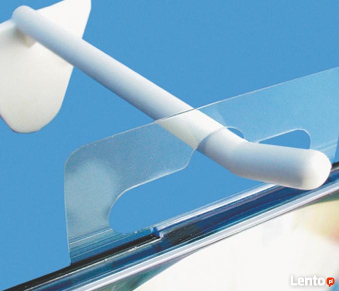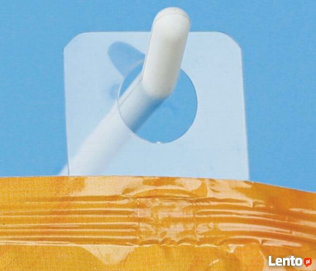 Zawieszki wykonane są z przezroczystej folii PCV z paskiem taśmy klejącej. Mogą być stosowane do opakowań z folii, papieru oraz kartonu.Zawieszki umożliwiają ekspozycję produktu, który pierwotnie nie miał możliwości podwieszenia.