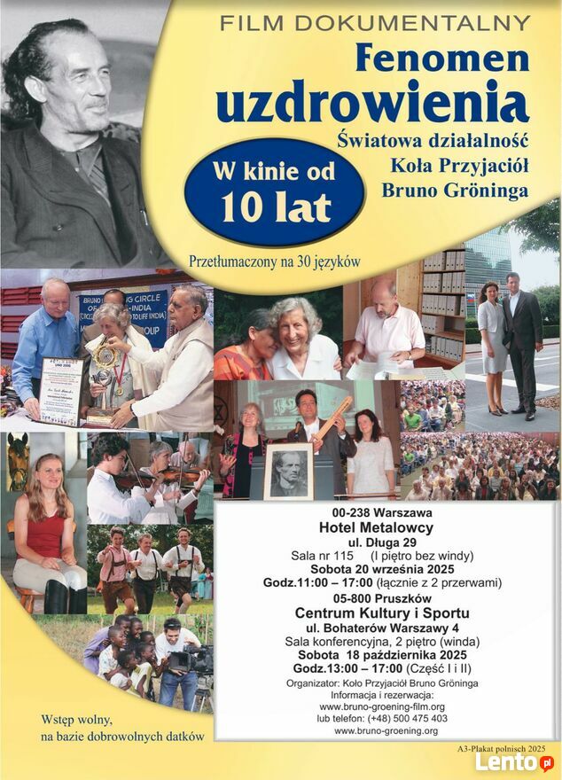 Zapraszamy na projekcję filmu dokumentującego wydarzenia UZDROWIEŃ NA DRODZE DUCHOWEJ. Ludzie z ponad 35 krajów relacjonują o cudownych przeżyciach, pomocy i uzdrowieniach, które dokonują się dzięki stosowaniu nauki Bruno Gröninga.