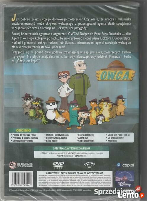 Fineasz i Ferb: Agent zwierzak [DVD] Phineas And Ferb: Animal Agents Kraj: USA, Wielka Brytania Rok produkcji: 2011, 2014, 2016, 2013 Reżyseria: Robert Hughes, Zac Moncrief Scenariusz: Michael Ryan, George Lucas, Mike Bell, Patrick O'Connor, Derek Thompson, Bob Roth, Kent Osborne, Bill Motz, Tom Minton, Robert Hughes, Damon Lindelof, Martin Olson, Dan Povenmire, Patrick A. Ventura, David Shayne, Kaz, Bobby Gaylor, Jeff 'Swampy' Marsh, Scott D. Peterson, ... Muzyka: Danny Jacob Obsada: Dee Bradley Baker, Jeff Bennett, Fred Tatasciore, Jim Cummings, Kevin Michael Richardson, Grey Griffin, Tara Strong, Danny Trejo, John DiMaggio, Rob Paulsen, Tom Kenny, Kari Wahlgren, Jess Harnell, Phil LaMarr, Clancy Brown, Corey Burton, Malcolm McDowell, Stephen Root, J.K. Simmons, ... Opis Jak dobrze znasz swojego domowego zwierzaka? Czy wiesz, że urocza i milusińska powierzchowność może skrywać walczącego z przestępcami agenta służb specjalnych w brązowej fedorze i z licencją na... ekscytujące przygody? Poznaj bohaterskich agentów z organizacji OWCA! Dołącz do Pepe Pana Dziobaka - alias Agent P - i jego kolegów po fachu, by pokrzyżować niecne plany Doktora Dundersztyca. Kudłaci i pierzaści, pokryci łuskami lub śluzem... nieustraszeni agenci zawzięcie walczą ze złem w okręgu trzech stanów i poza nim! Przygotuj się na ponad dwie godziny trzymającej w napięciu akcji, zwierzęcych żartów i przygód. Na płycie znajdziesz m.in. kultowy, dwuczęściowy odcinek "Fineasza i Ferba" pt. "Gdzie jest Pepe?"! Stan produktu Produkt ORYGINALNY. Płyta NOWA. Tytuł: Fineasz i Ferb: Agent zwierzak Dział: DVD Kraj wydania: Polska Kategoria wiekowa (MPAA): TV-Y7 Czas trwania: 155 min. Dodatki: bezpośredni dostęp do scen menu interaktywne zwiastun Napisy: angielskie, Dźwięk: Dolby Digital 2.0 polski Dolby Digital 2.0 angielski hebrajski Polska wersja: dubbing Obraz: 1,78:1 Region DVD: 2 Opakowanie: keep case Liczba nośników: [1xDVD] Karton 83 Ogłoszenie jest aktualne dopóki znajduje się na stronie . Odbiór osobisty lub wysyłkaSprawdź zainteresowanie tym ogłoszeniem