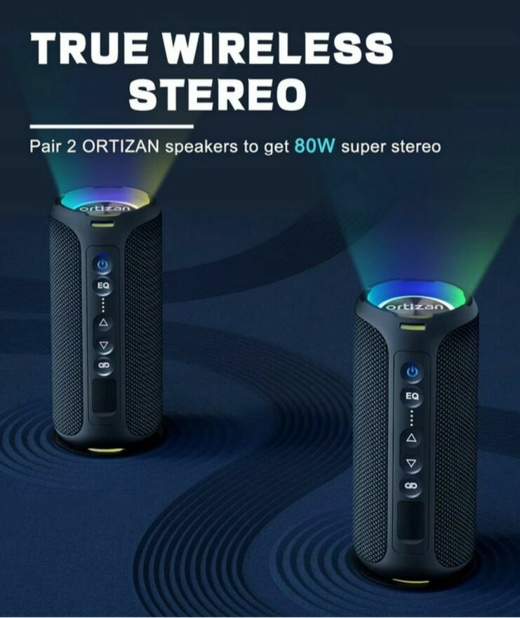 Głośniki Bluetooth Ortizan, przenośny głośnik bezprzewodowy o mocy 40W, wodoodporne głośniki prysznicowe IPX7 z Bluetooth 5.3, głęboki bas, oświetlenie LED, mikrofon, prawdziwe bezprzewodowe stereo do domu, na zewnątrz.Specyfikacja:
