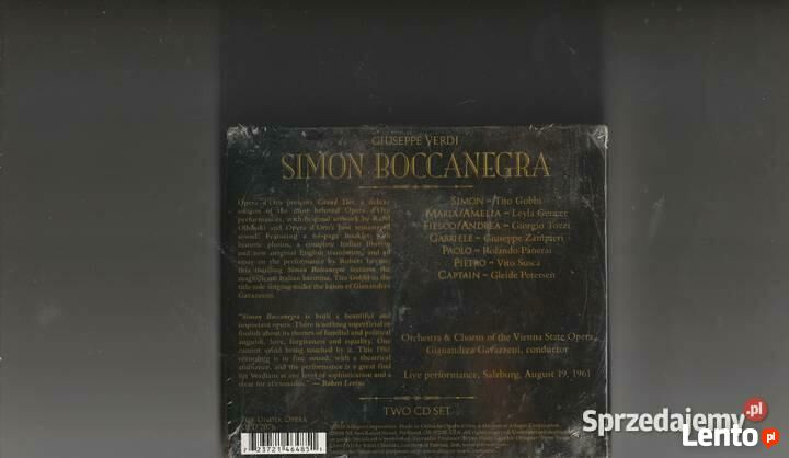 Plyta nowa jedynie lekko podniszczona folia GIUSEPPE VERDI SIMON BOCCANEGRA Opera d'Oro presents Grand Tier, a deluxe edition of the most beloved Opera d'Oro performances, with original artwork by Rafil. Olbinski and Opera d'Oro's best remastered. sound! Featuring a 64-page booklet. with: historic photos, a complete Italian libretto and new original English translation/ und an essay on the performance by Robert Iyer this thrilling Simon Boccanegra features the magnificent Italian baritone, Tito Gobbi in the title role singing under the baton of Gianandren Gavazenni. "Simon Boccanegra is both a beautiful and important opera. There is nothing superficial or foolish about its themes of familial and political anguish, love, forgiveness and equality. One cannot avoid being touched by it. This 1961 recording is in fine sound, with a theatrical ambiance, and the performance is a great find for Verdians at any level of sophistication and a treat for aficionados." -Robert Levine. SIMON-Tito Gobbi MARIA/AMELIA - Leyla Gencer FIESCO ANDREA Giorgio Tozzi GABRIELE Giuseppe Zampieri PAOLO Rolando Panerai PIETRO Vito Susca CAPTAIN Gleide Petersen Orchestra & Chorus of the Vienna State Opera Gianandreas Gavazzeni, conductor Live performance, Salzburg, August 19, 1961 TWO CD SET 2010 Allegro Corporation. Made in China by Opera d'Oro, a division of Allegro Corporation. 20048 NE San Rafael Street, Portland, OR 97230, USA. All rights reserved. Unauthorized duplicati Karton 94 Ogłoszenie jest aktualne dopóki znajduje się na stronie . Odbiór osobisty lub wysyłkaSprawdź zainteresowanie tym ogłoszeniem
