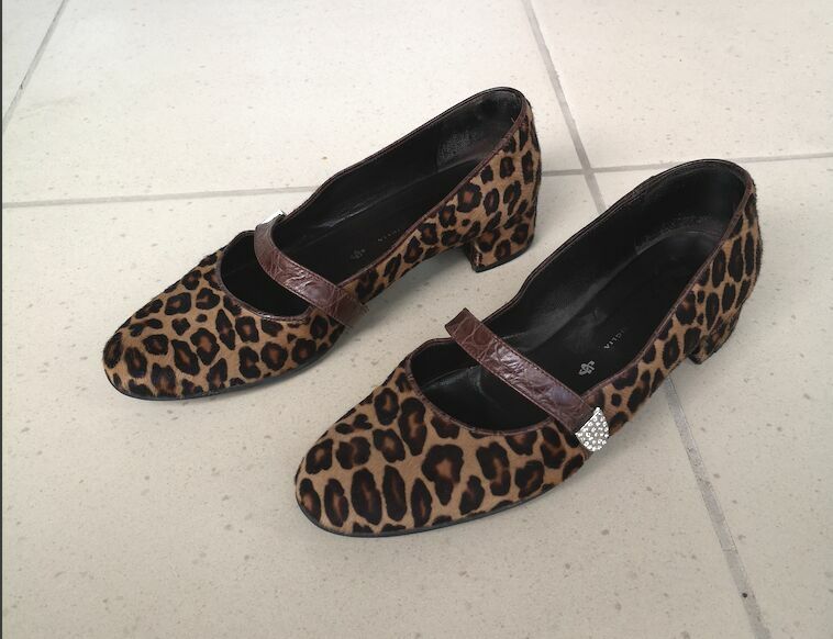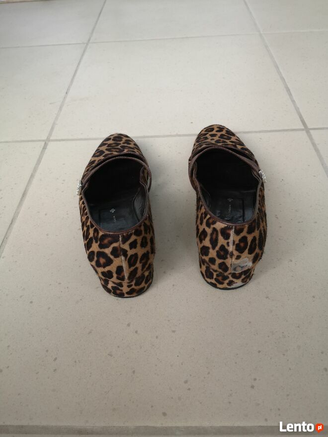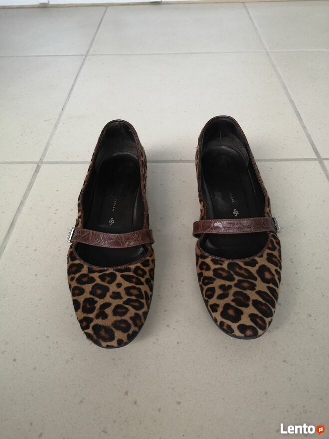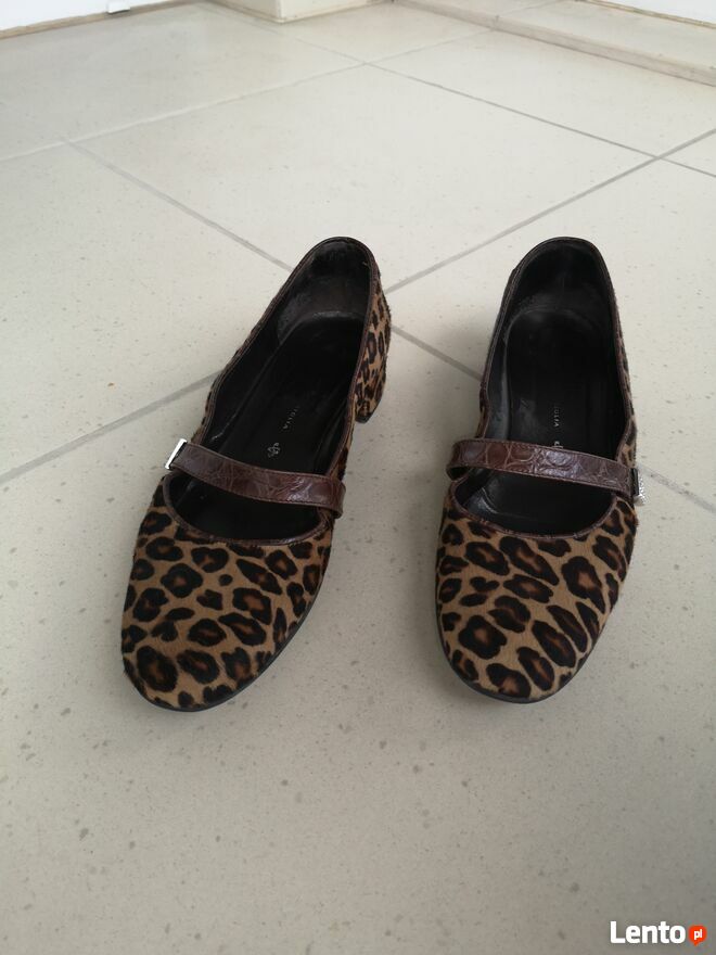 WitamMam do sprzedania bardzo ładne damskie czółenka baleriny buty włoskiej firmy GUIDO SGARIGLIA w panterce, wykonane z naturalnej skóry na zewnątrz oraz w środku (100% oryginał). Stan dobry, tylko jest jeden mankament: przetarcie z tyłu na prawym bucie od trzymania nogi na pedale gazu w samochodzie (widoczny na ostatnim zdjęciu). Made in Italy.