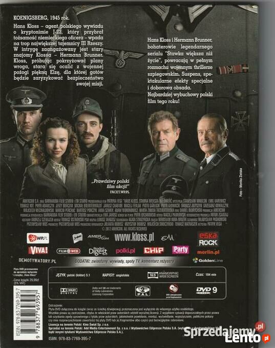 Hans Kloss. Stawka większa niż śmierć (booklet) [DVD] Hans Kloss. Stawka wieksza niz smierc Kraj: Polska Rok produkcji: 2012 Reżyseria: Patryk Vega Scenariusz: Wladyslaw Pasikowski, Władysław Pasikowski, Przemyslaw Wos Muzyka: Lukasz Targosz Obsada: Daniel Olbrychski, Janusz Chabior, Piotr Grabowski, Piotr Adamczyk, Adam Woronowicz, Piotr Glowacki, Jerzy Bonczak, Wojciech Mecwaldowski, Tomasz Kot, Andrzej Precigs, Marcin Perchuc, Emil Karewicz, Grzegorz Kowalczyk, Tomasz Sobczak, Wojciech Machnicki, Witold Bielinski, Michal Breitenwald, Marek Kossakowski, Stanislaw Mikulski, ... Opis Koenigsberg, 1945 rok. Hans Kloss (Tomasz Kot) - agent polskiego wywiadu o kryptonimie J-23 - wpada na trop skarbu zrabowanego przez nazistów. W intrygę zaangażowany jest stary znajomy Klossa - Hermann Brunner (Piotr Adamczyk). Kloss, próbując pokrzyżować plany wroga, stara się ocalić z wojennej pożogi piękną Elzę (Marta Żmuda Trzebiatowska), dla której gotów będzie zaryzykować bezpieczeństwo swojej misji. Twórcy "Klossa" nie ukrywają inspiracji klasyką gatunku - filmami "Tylko dla orłów" i "Komandosi z Nawarony". "Hans Kloss. Stawka większa niż śmierć" to trzymający w napięciu, szpiegowski film wojenny utrzymany w klimacie legendarnego serialu, ale opowiedziany językiem współczesnego kina - ze spektakularnymi efektami specjalnymi i dynamiczną, pełną suspensu akcją. W obsadzie znaleźli się znakomici aktorzy w nowych, zaskakujących wcieleniach, a także niezapomniani serialowi antagoniści Brunner i Kloss - Emil Karewicz oraz Stanisław Mikulski, których spotkanie po latach będzie wstępem do pasjonującej podróży w przeszłość i odkrycia jednej z największych tajemnic III Rzeszy. Stan produktu Produkt ORYGINALNY.Płyta w prawie idealnym stanie. Dział: DVD Dodatki: bezpośredni dostęp do scen Napisy: angielskie Dźwięk: Dolby Digital 5.1 polski Polska wersja: polska produkcja Obraz: 16:9 / 1,85:1 Region DVD: 2 Opakowanie: booklet Liczba nośników: [1xDVD] + [1xKSIĄŻKA] Karton 95 Ogłoszenie jest aktualne dopóki znajduje się na stronie . Odbiór osobisty lub wysyłkaSprawdź zainteresowanie tym ogłoszeniem