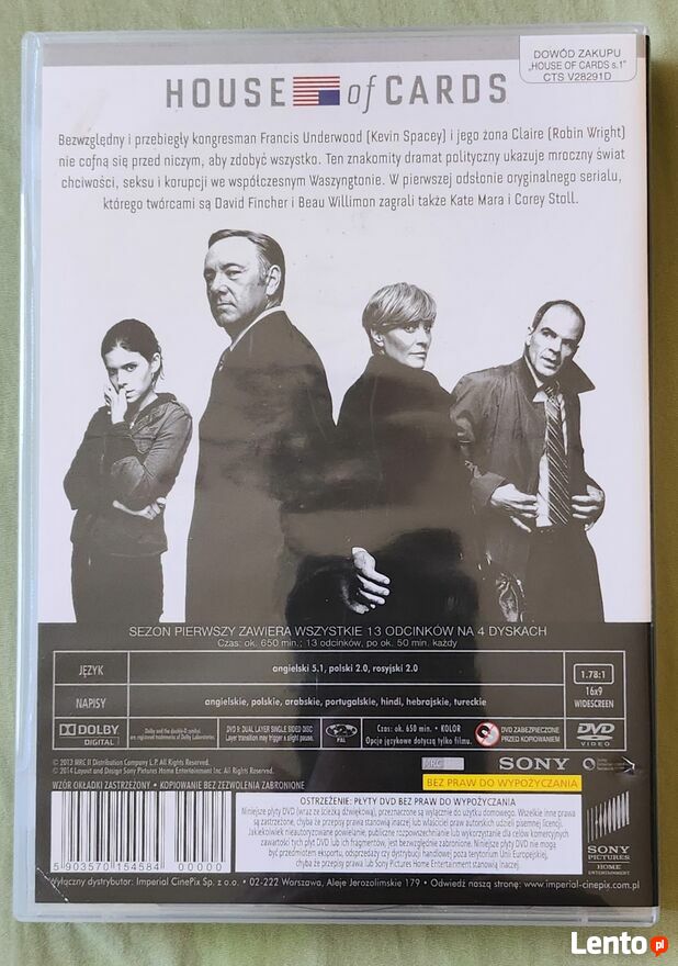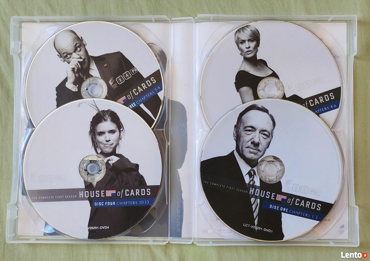 "ogłoszenie widoczne = AKTUALNE"House of cards, sezon 1 box 4 płyt na dvd. Płyty bez uszkodzeń.