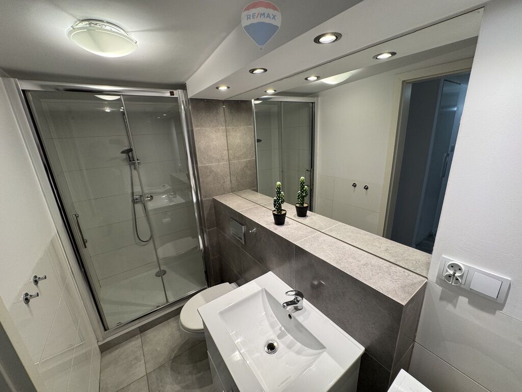 Łazienka z dużym prysznicem, dużym lustrem i wydajnym