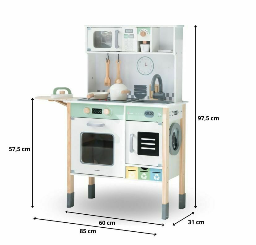Interaktywna Drewniana kuchnia dla dzieci z mikrofalówką z pralką, zmywarką i tablicą kredowąWykonana z drewna kuchnia zapewni Twojemu dziecku wiele godzin fantastycznej zabawy, która za każdym razem może przebiegać według innego scenariusza. Posiada solidną konstrukcję, a wszystkie jej elementy zostały starannie wykonane. To fantastyczny prezent dla małych pasjonatów gotowania!