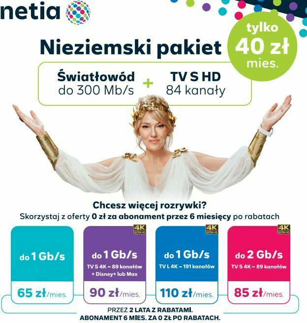Netia jest Warszawskim dostawcą usług Internetu światłowodowego i telewizji kablowej. Usługi świadczymy na terenie Bródna Tarchomin Praga północ Praga południe Bielany Mokotów Żoliborz Bemowo Białołęka Śródmieście Ochota Ursynów Ursus Włochy Wola Wilanów Wawer Wesoła Rembertów. Nasz internet stacjonarny z WiFi 6 w Netii jest stabilny i niezawodny - idealny do pracy i nauki zdalnej. Zróżnicowana oferta pakietów telewizji z dekoderem 4K i Internetu w atrakcyjnych cenach dla osób prywatnych i firm. Świadczymy usługi w różnych technologiach PON, HFC, ETTH. Dostarczamy produkty światłowodowe z maksymalną prędkością do 2000 Mb/s."Netia Przedstawiciel Handlowy