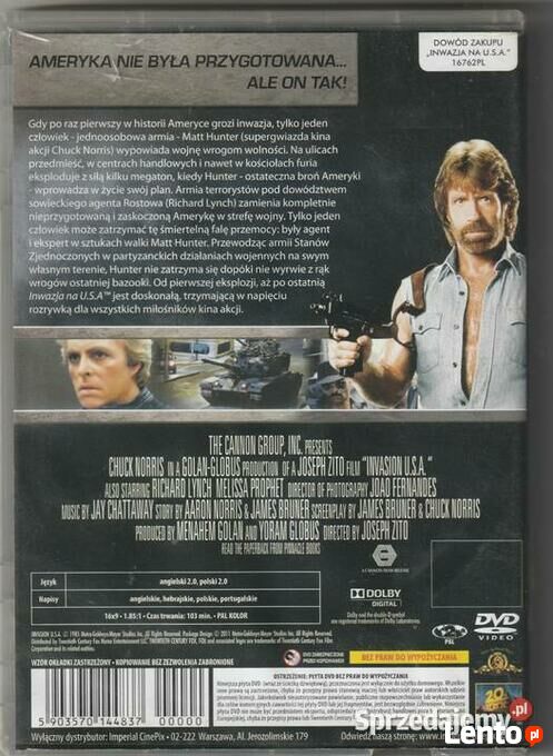 Inwazja na USA (polski lektor) [DVD] Invasion U.S.A. Kraj: USA Rok produkcji: 1985 Reżyseria: Joseph Zito Scenariusz: Chuck Norris, Aaron Norris, James Bruner Muzyka: Jay Chattaway Obsada: Howard Jackson, Chuck Norris, Andy Stahl, Bernie McInerney, Mario Ernesto Sánchez, Richard Lynch, Vince Canlas, Anthony Marciona, Gerard Murphy, Anthony Correa, Pat Ryan, Bob Hannah, Dan Albright, Dan Fitzgerald, Ruben Rabasa, Alexander Zale, Bruce Evers, Laura Whyte, Melissa Prophet, ... Opis Ameryka nie była przygotowana.Ale on tak!Gdy, po raz pierwszy w historii, Ameryce grozi inwazja, tylko jeden człowiek - jednoosobowa armia - Matt Hunter (super gwiazda kina akcji Chuck Norris) wypowiada wojnę wrogom wolności. Na ulicach przedmieść, w centrach handlowych i nawet w kościołach furia eksploduje z siłą kilku megaton, kiedy Hunter, ostateczna broń Ameryki, wprowadza w życie swój plan.Armia terrorystów pod dowództwem sowieckiego agenta Rostova (Richard Lynch) zamienia kompletnie nieprzygotowaną i zaskoczoną Amerykę w strefę wojny. Tylko jeden człowiek może zatrzymać tę śmiertelną falę przemocy: były agent i ekspert w sztukach walki Matt Hunter. Przewodząc Armii Stanów Zjednoczonych w partyzanckich działaniach wojennych, na swym własnym terenie, Hunter nie zatrzyma się dopóki nie wyrwie z rąk wrogów ostatniej bazooki. Od pierwszej eksplozji, aż po ostatnią Inwazja na U.S.A jest doskonałą, trzymająca w napięciu rozrywką dla wszystkich miłośników kina akcji. Stan produktu Produkt ORYGINALNY. Płyta NOWA. Tytuł: Inwazja na USA Tytuł czeski: Invaze U.S.A. Nr katalogowy: 16762PL Dział: DVD Kategoria wiekowa (MPAA): R Czas trwania: 103 min. Dodatki: bezpośredni dostęp do scen Napisy: polskie, angielskie, hebrajskie, portugalskie Dźwięk: Dolby Digital 2.0 polski Dolby Digital 2.0 angielski Polska wersja: lektor, napisy Obraz: 16:9 / 1,85:1 Region DVD: 2 Opakowanie: keep case Liczba nośników: [1xDVD] Pęknięte pudelko Karton 82 Ogłoszenie jest aktualne dopóki znajduje się na stronie . Odbiór osobisty lub wysyłkaSprawdź zainteresowanie tym ogłoszeniem