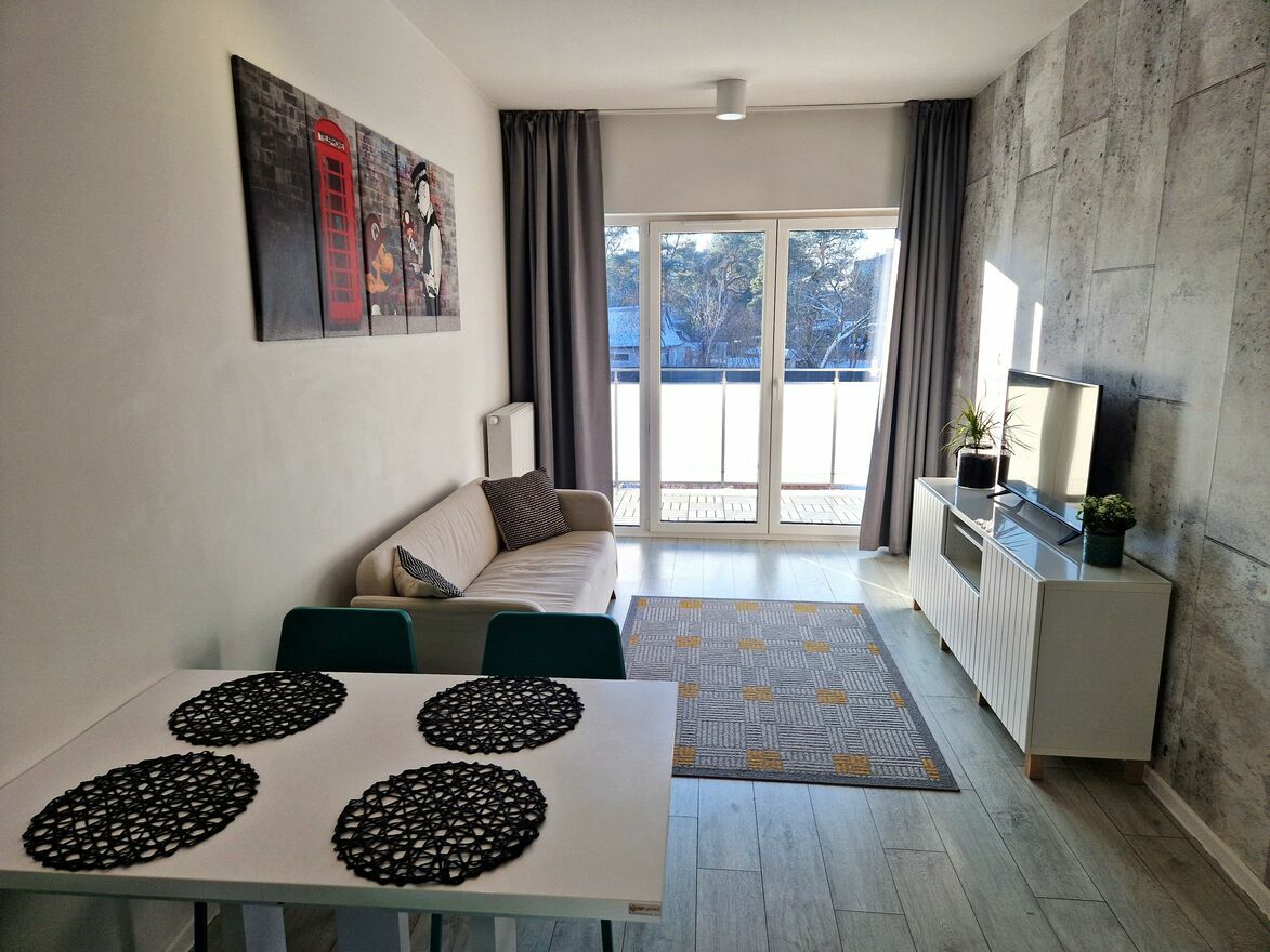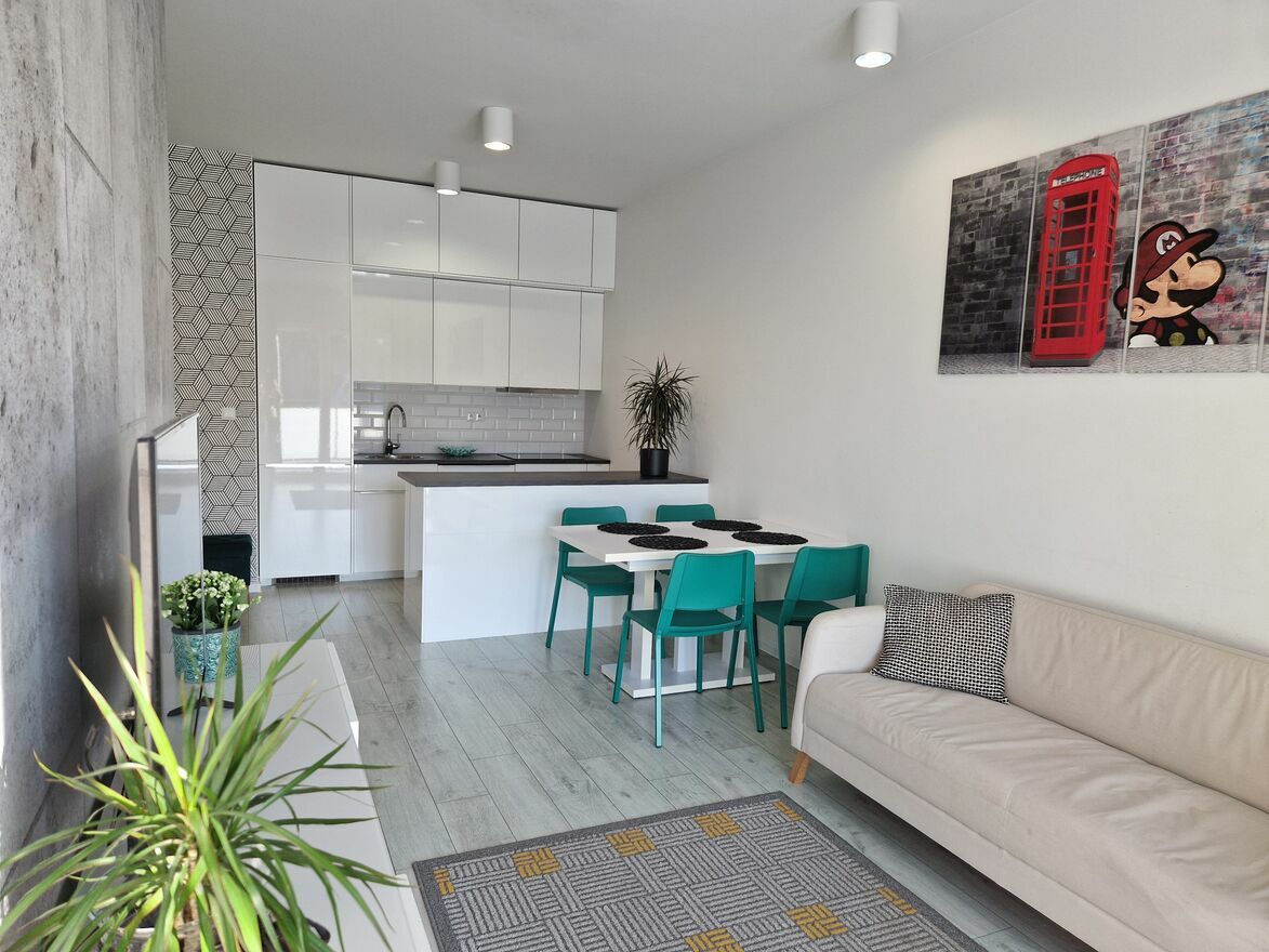 • Przestronny salon z aneksem kuchennym i bezpośrednim wyjściem na duży, umeblowany balkon,