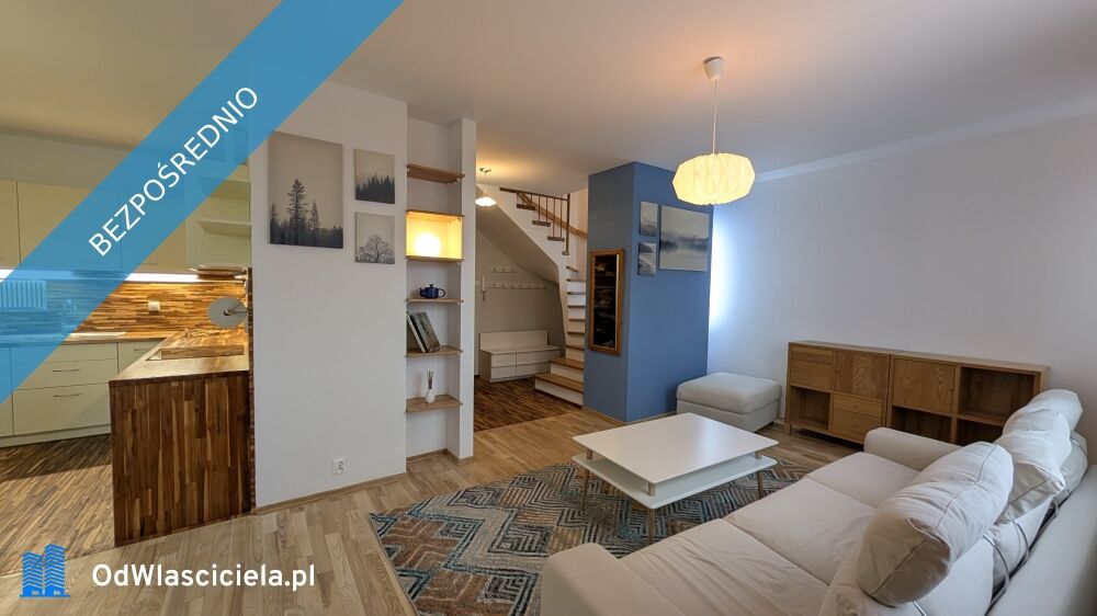Mieszkanie jasne i słoneczne, okna wychodzą na południowy zachód. Za oknami dużo zieleni i nieprzesłonięty widok.Mieszkanie składa się z dwóch poziomów po ok. 40m2 (łączna powierzchnia „po podłodze” to ponad 85m2). Na dolnym poziomie jest duża otwarta przestrzeń: salon połączony z częścią jadalną i kuchnią. Z salonu wyjście na loggię.
