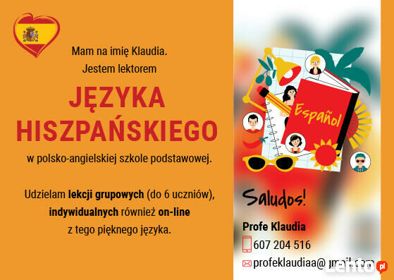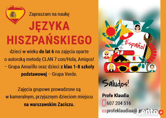 Mam na imię Klaudia I jestem lektorem jezyka hiszpanskiego w polsko- angielskiej szkole podstawowej. Zapraszam dzieci na organizowane przeze mnie autorskie zajecia CLAN 7 con Hola Amigos od podstaw ( zajecia dla dzieci juz od 4 roku życia) a także dla uczniów szkoły podstawowej z podziałem na grupy wiekowe. Na zajeciach bawimy się, śpiewamy I wykorzystujemy materialy adekwatne do wieku uczestników kursu.Zajecia prowadzone są w kameralnym i spokojnych miejscu Langusta na warszawskim zaciszu.