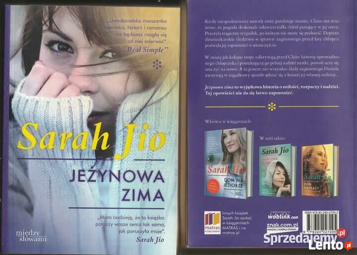 JEŻYNOWA ZIMA SARAH JIO UWODZICIELKA Kiedy niespodziewany nawrót zimy paraliżuje miasto, Claire ma wrażenie, że pogoda doskonale odzwierciedla chłód panujący w jej sercu. Przeżyła tragiczny wypadek, po którym nie może się podnieść. Dopiero dziennikarskie śledztwo, jakie prowadzi w sprawie zaginionego przed laty chłopca, pozwala jej zapomnieć o nieszczęściu. W miarę jak kolejne tropy odkrywają przed nią historię uprowadzonego chłopczyka i poszukującej go pełnej nadziei matki, Claire powoli uczy się żyć na nowo. A to jeszcze nie wszystko: ślady zaginionego Daniela zaczynają w zagadkowy sposób splatać się z losami jej własnej rodziny... „Jeżynowa zima” to wyjątkowa historia o miłości, rozpaczy i nadziei. Tej opowieści nie da się łatwo zapomnieć. Wydawca:Między slowami Rok wydania: 2015 Oprawa: OPRAWA BROSZUROWA Ilość stron: 318 Karton 82 Ogłoszenie jest aktualne dopóki znajduje się na stronie . Odbiór osobisty lub wysyłkaSprawdź zainteresowanie tym ogłoszeniem