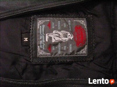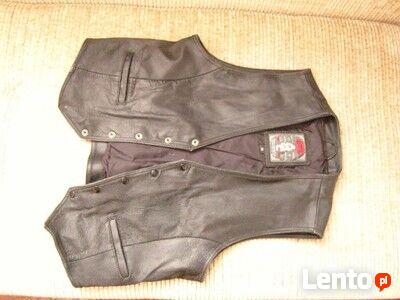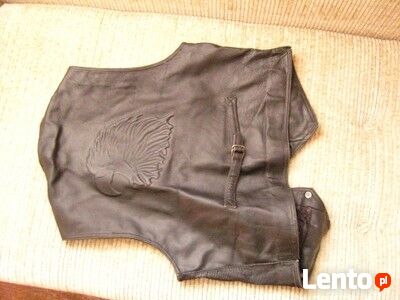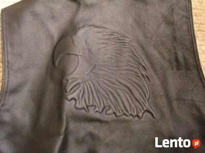 Skórzana kamizelka motocyklowa lub hardrockowa z wytłoczonym na plecach orłem, ze skóry bydlęcej twardej, ciężkiej, ze znanej firmy (patrz foto), używana, kompletna, rozmiar M, można obejrzeć i przymierzyć w Warszawie. Najchętniej odbiór osobisty. Sprzedaż prywatna ze względów osobistych.Adam