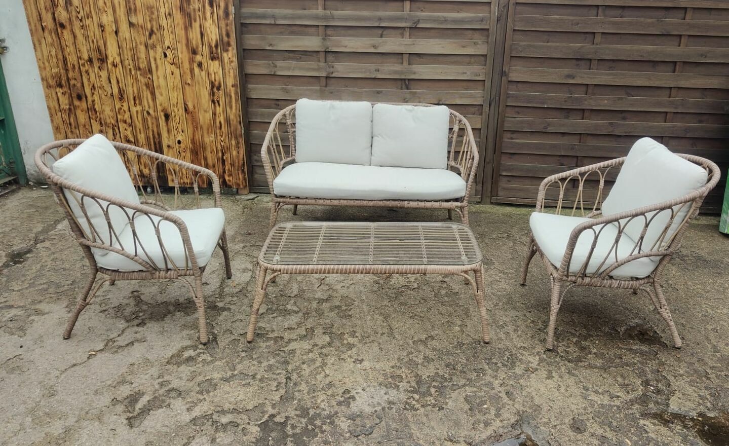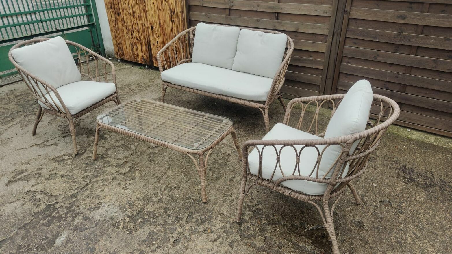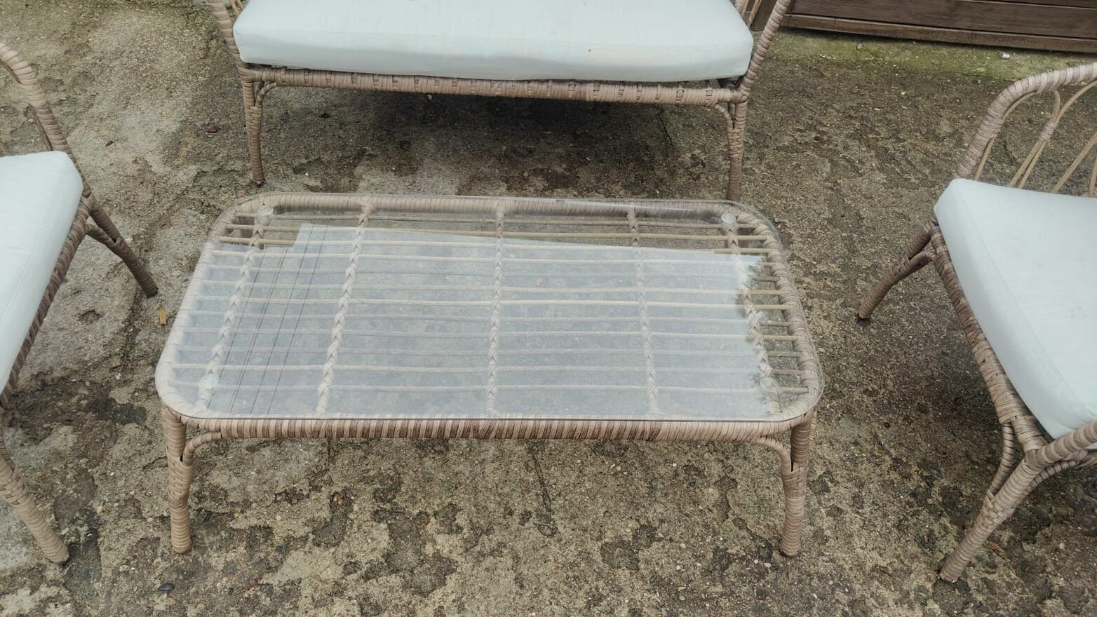 Komplet pięknych mebli ogrodowych - kanapa 2-osobowa + 2 x fotel + stolik ze szkłem hartowanym. Meble stalowe, pokryte technorattanem. W zestawie poduszki.Wymiary:
