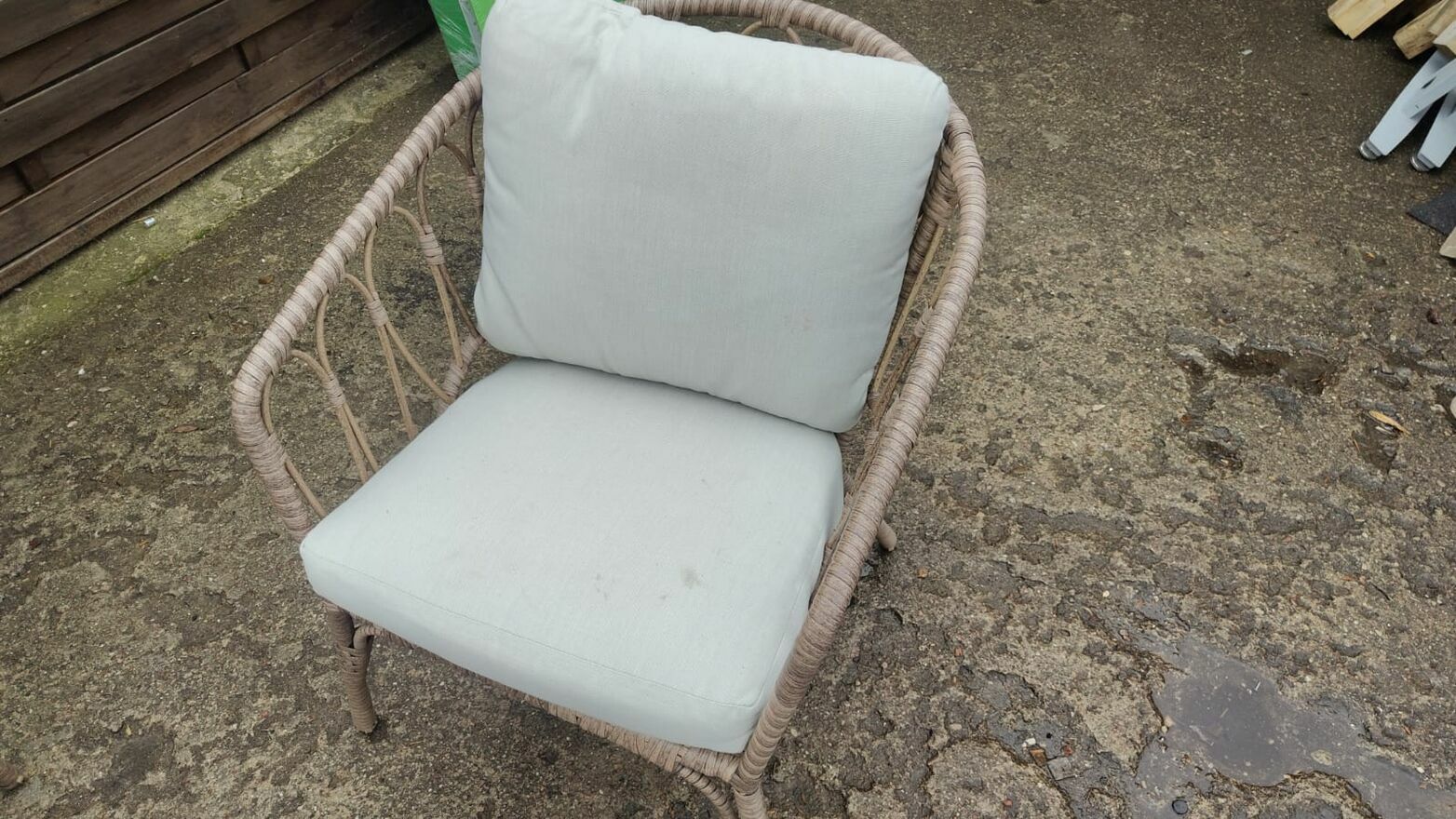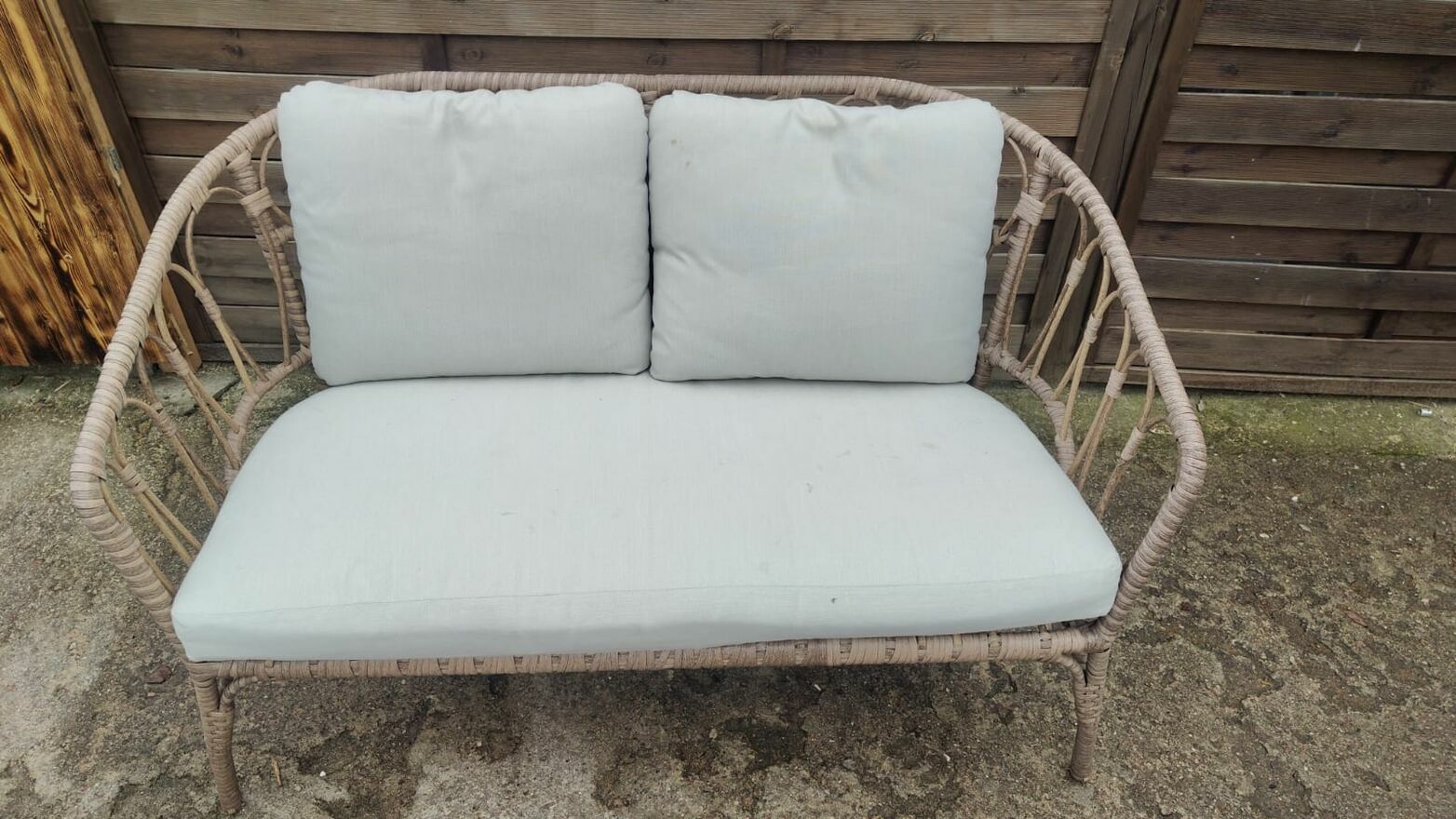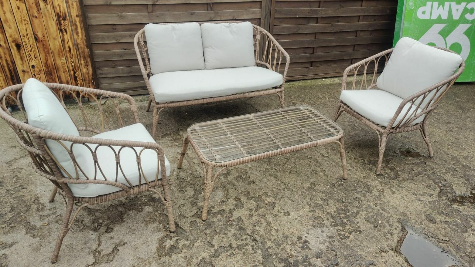 Komplet pięknych mebli ogrodowych - kanapa 2-osobowa + 2 x fotel + stolik ze szkłem hartowanym. Meble stalowe, pokryte technorattanem. W zestawie poduszki.Wymiary: