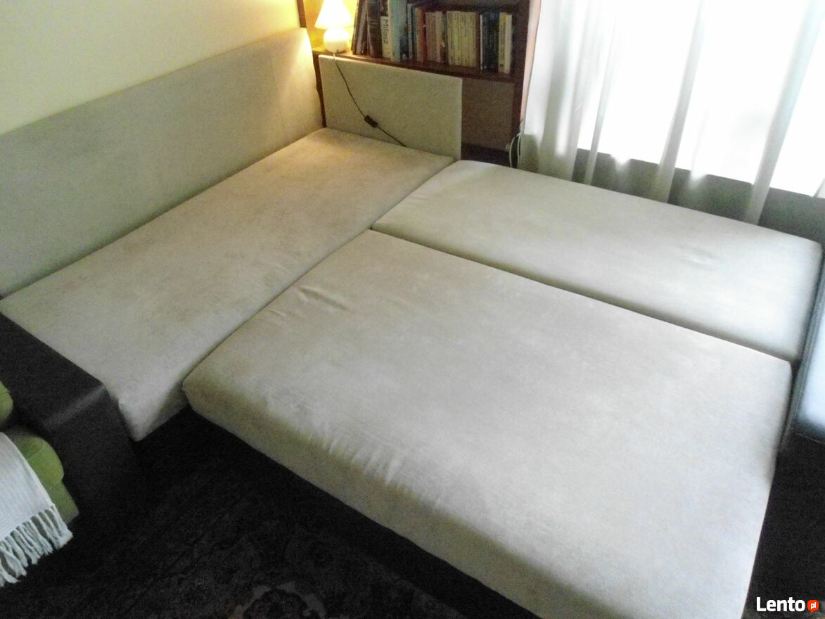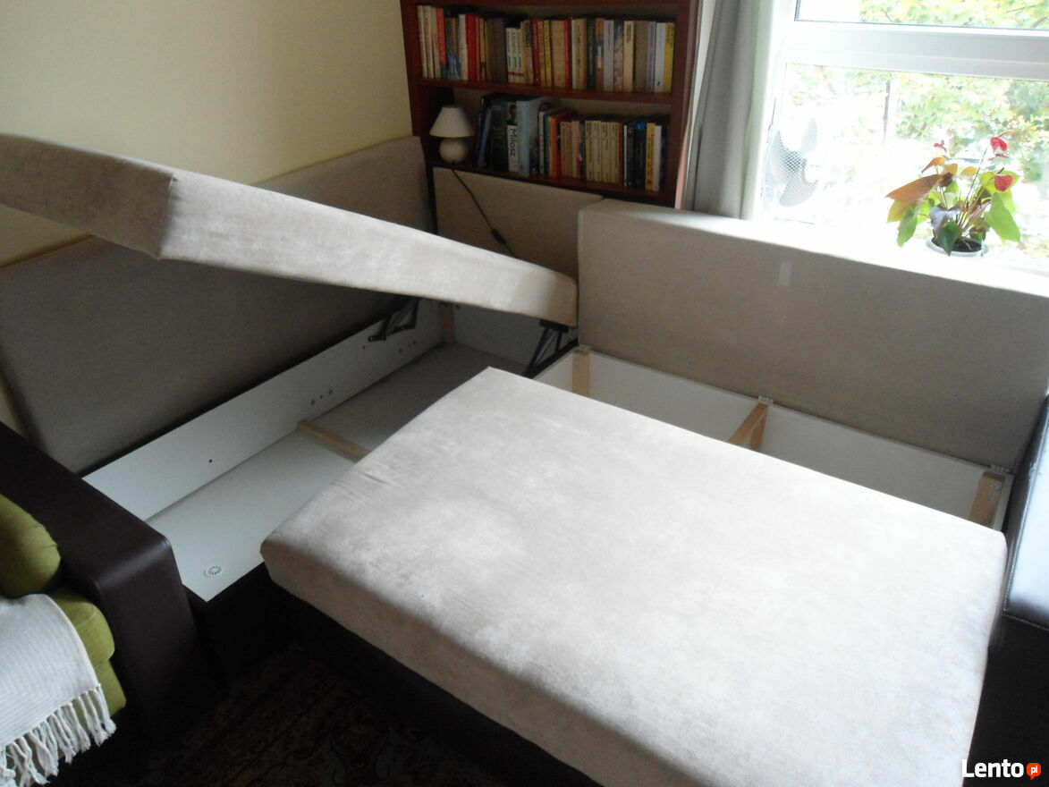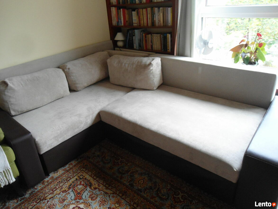 Kanapa narożna w dobrym stanie. Dwa duże pojemniki na pościel, poduszki. Powierzchnia spania 140x200 cm.Sprawdź zainteresowanie tym ogłoszeniem