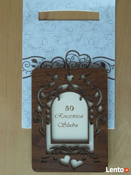 Kartka wykonana jest z imitacji drewna z pięknym ażurowym sercem wyciętym w okładce kartki,
