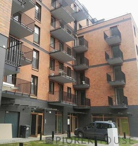 Budynek to nowoczesny apartamentowiec z ceglaną elewacją,