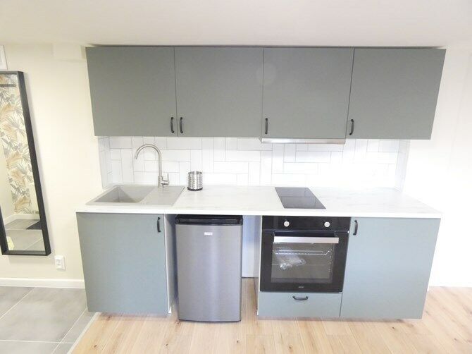 Kuchnia: lodówka, 2-palnikowa płyta indukcyjna, mikrofalówka, okap,
