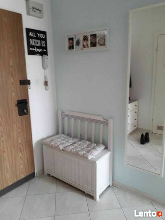 W przedpokoju znajduje się ławka/siedzisko na buty, szafka z szufladami,