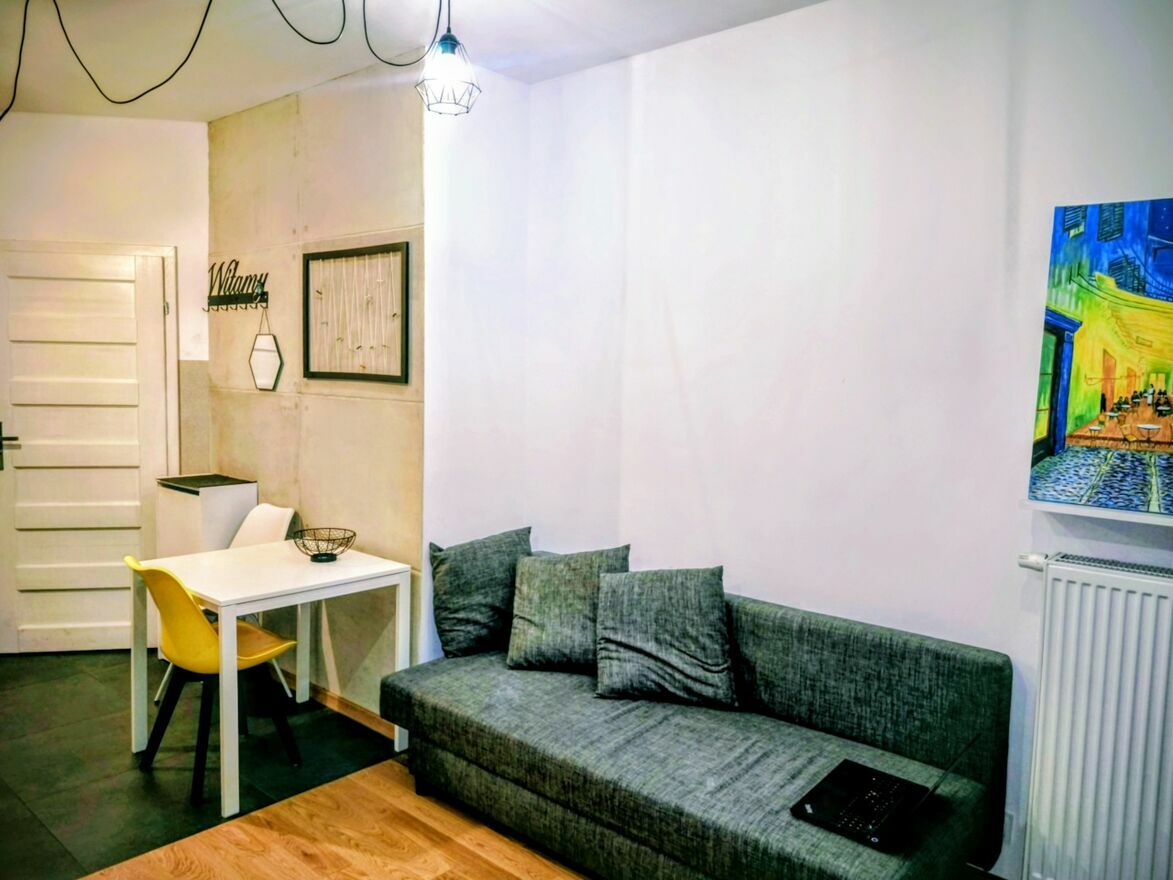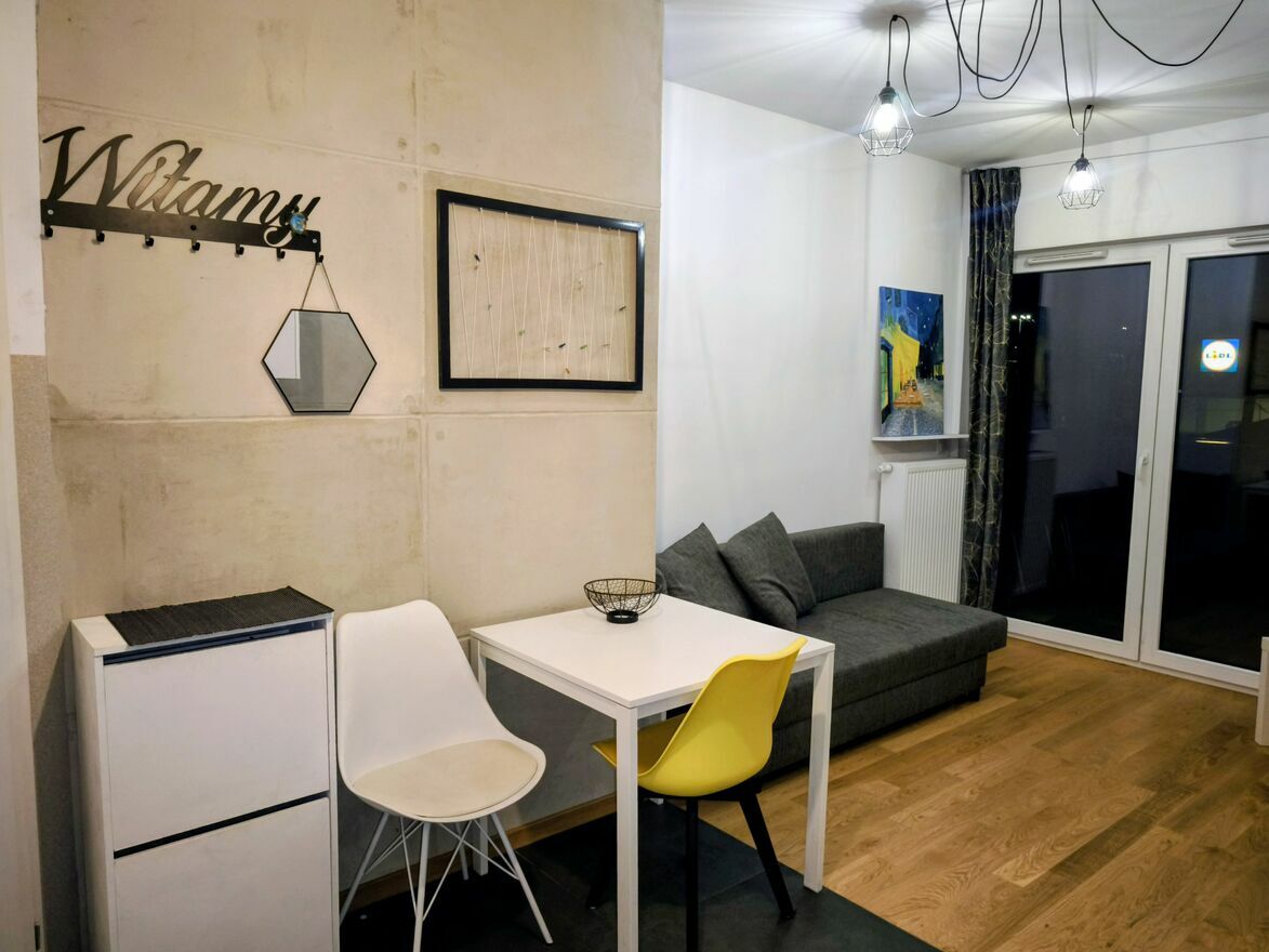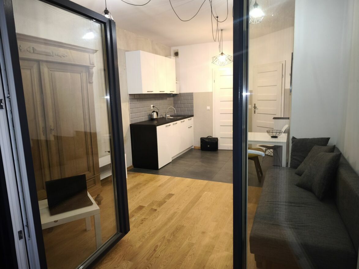 Studio całkowicie umeblowane i wyposażone, meble w zabudowie lodówka, czajnik , pralka itp., TV / obecnie wisi na ścianie miedzy szafa a meblami kuchennymi- nie ma na zdjeciach /