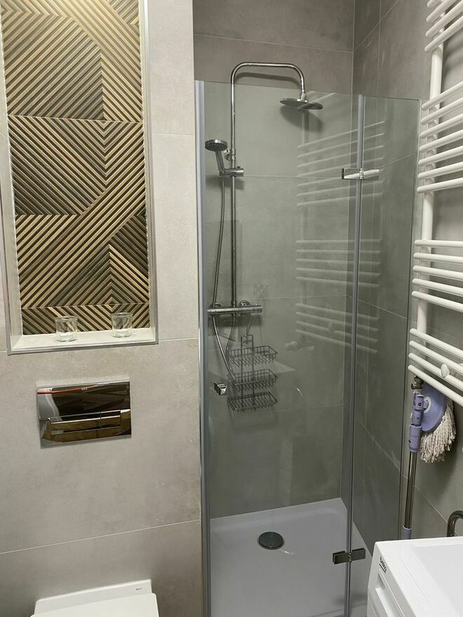 Elegancka łazienka z prysznicem i pralką.