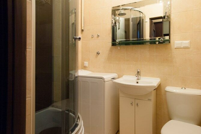 Łazienka: kabina prysznicowa, WC, umywalka, pralka, szafka, lustro.