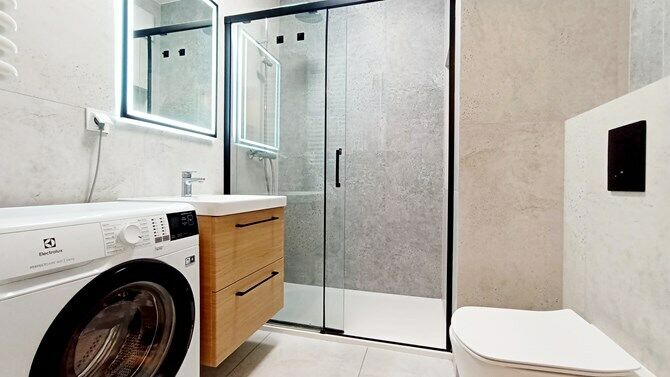 Łazienka: pralka, prysznic, WC, umywalka.