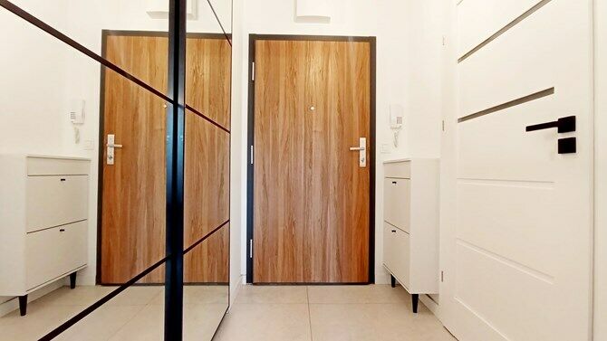 Przedpokój: szafa z lustrem, szafka na buty.