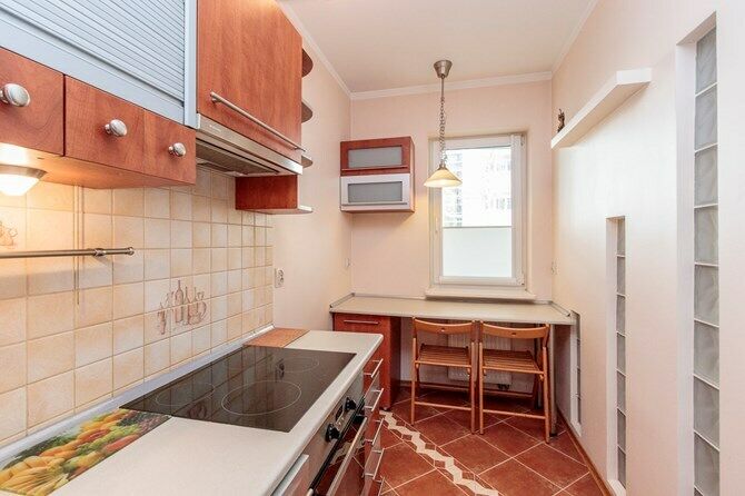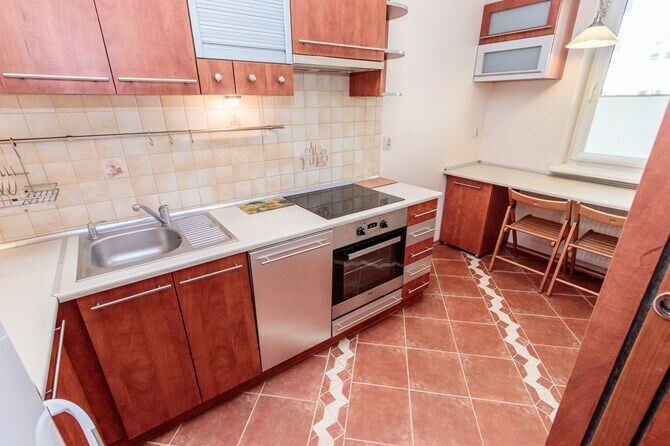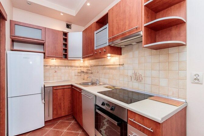 Kuchnia: szafki kuchenne, lodówko-zamrażarka, zmywarka, okap,