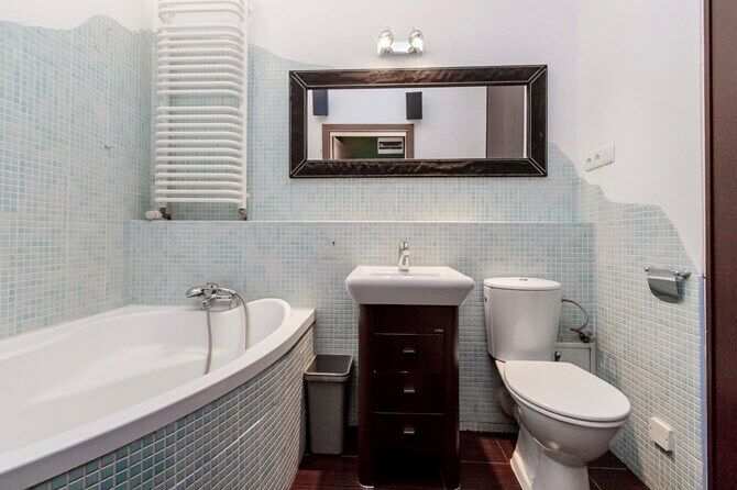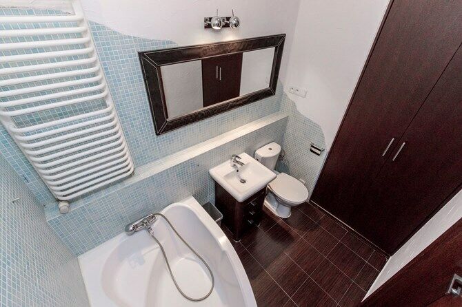 Łazienka: wanna, pralka w zabudowie z dużą szafą.