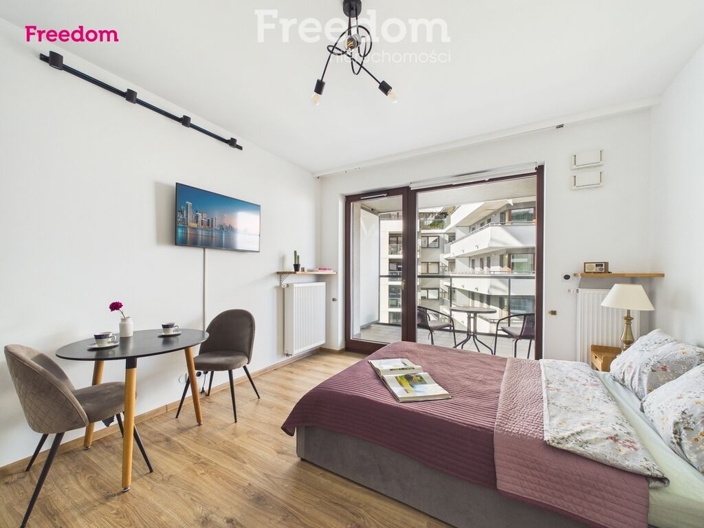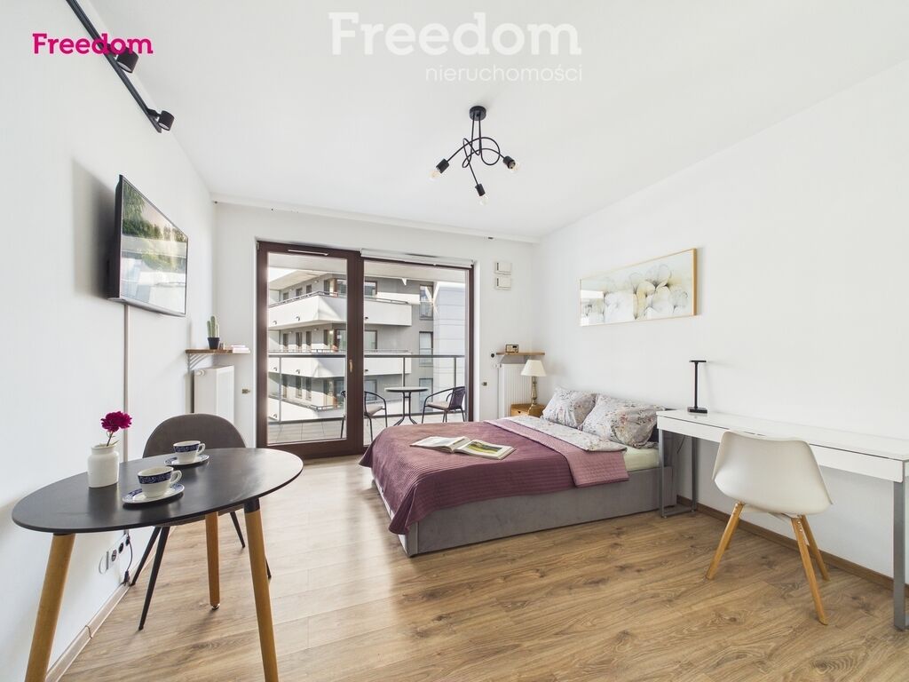 This modern studio with a balcony in Wola also features low monthly