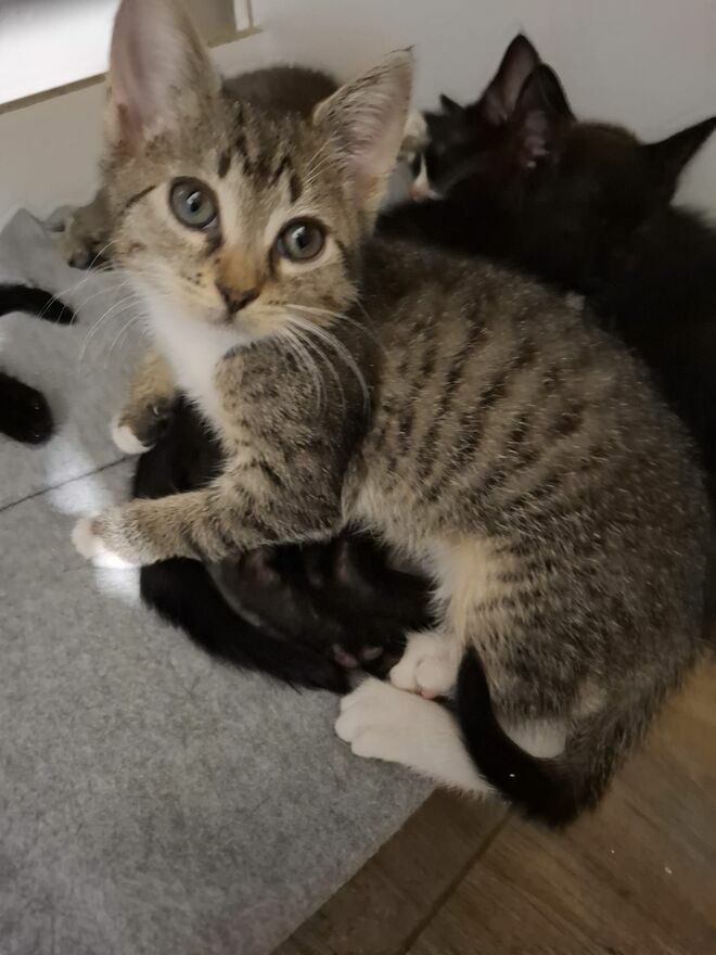 Obecnie do adopcji pozostały jeszcze 2 czarne kotki, czarno biała kotka i 2 szaro bure kociaki.