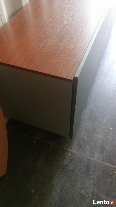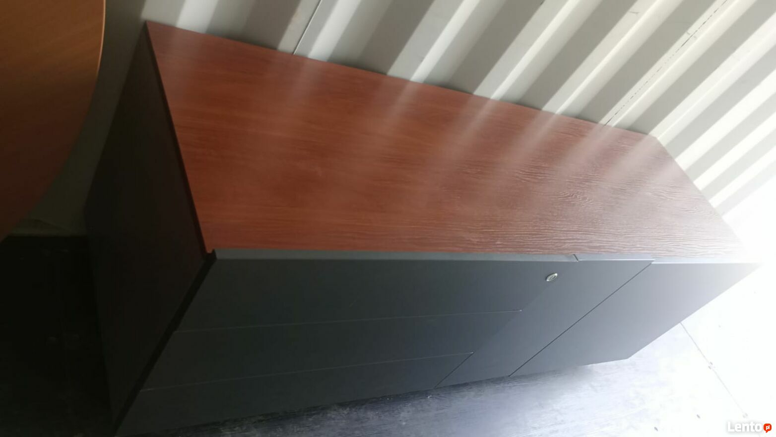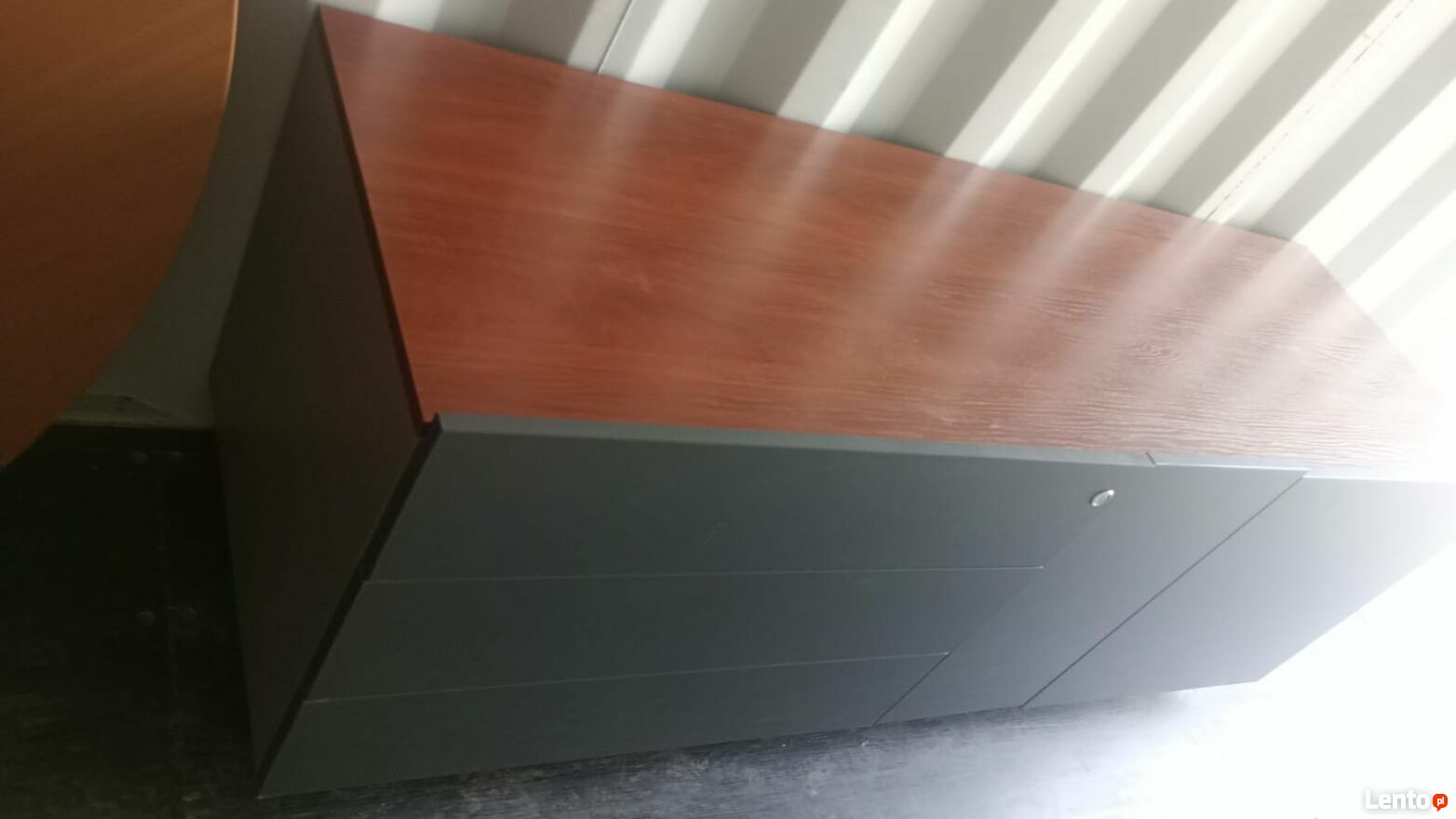 W ofercie komody biurowe kolor antracyt blat mahońKomoda składa się z trzech szuflad i dwóch szafek z półkami.