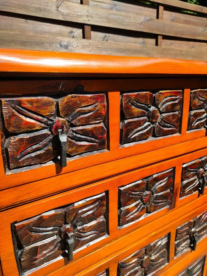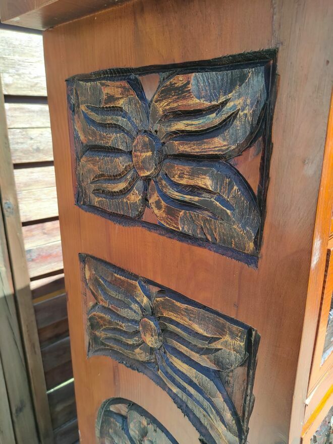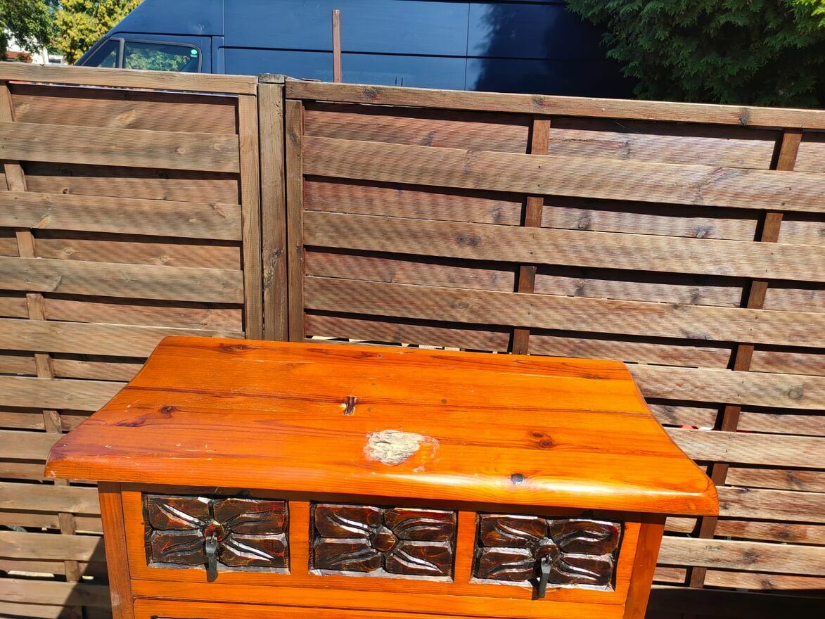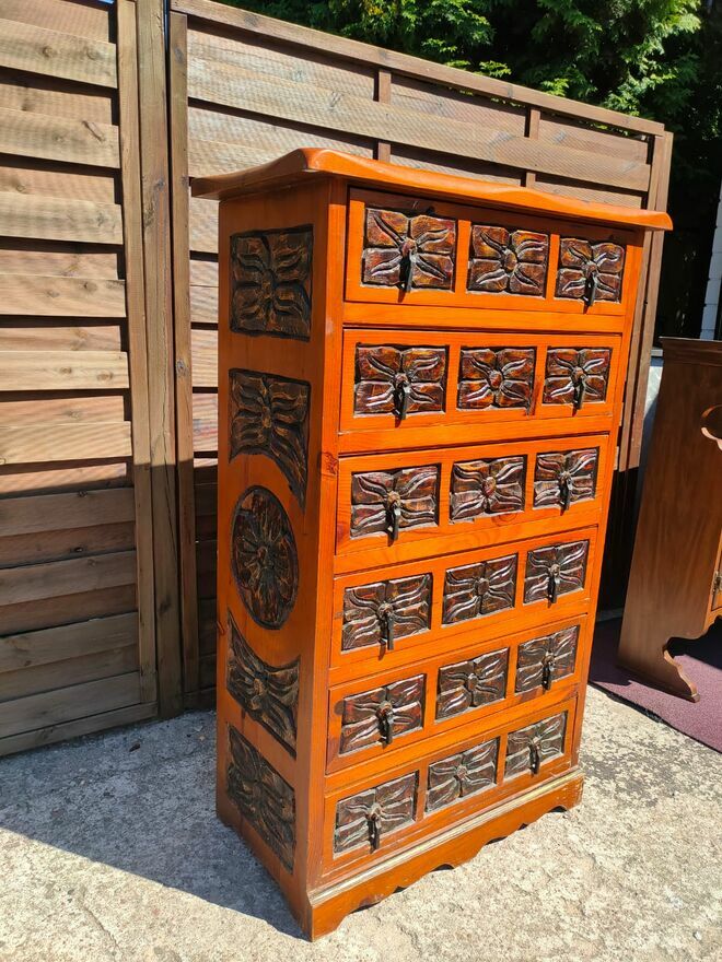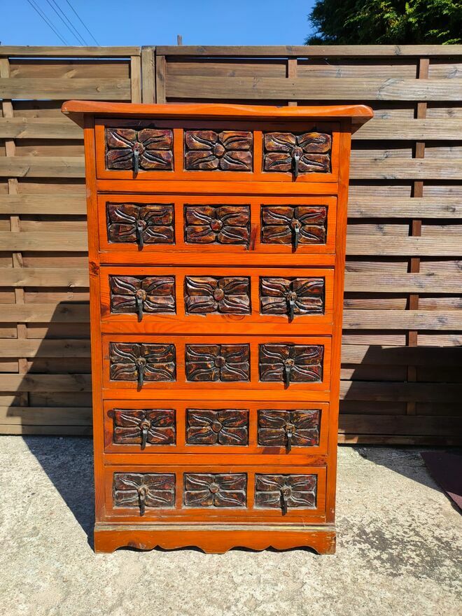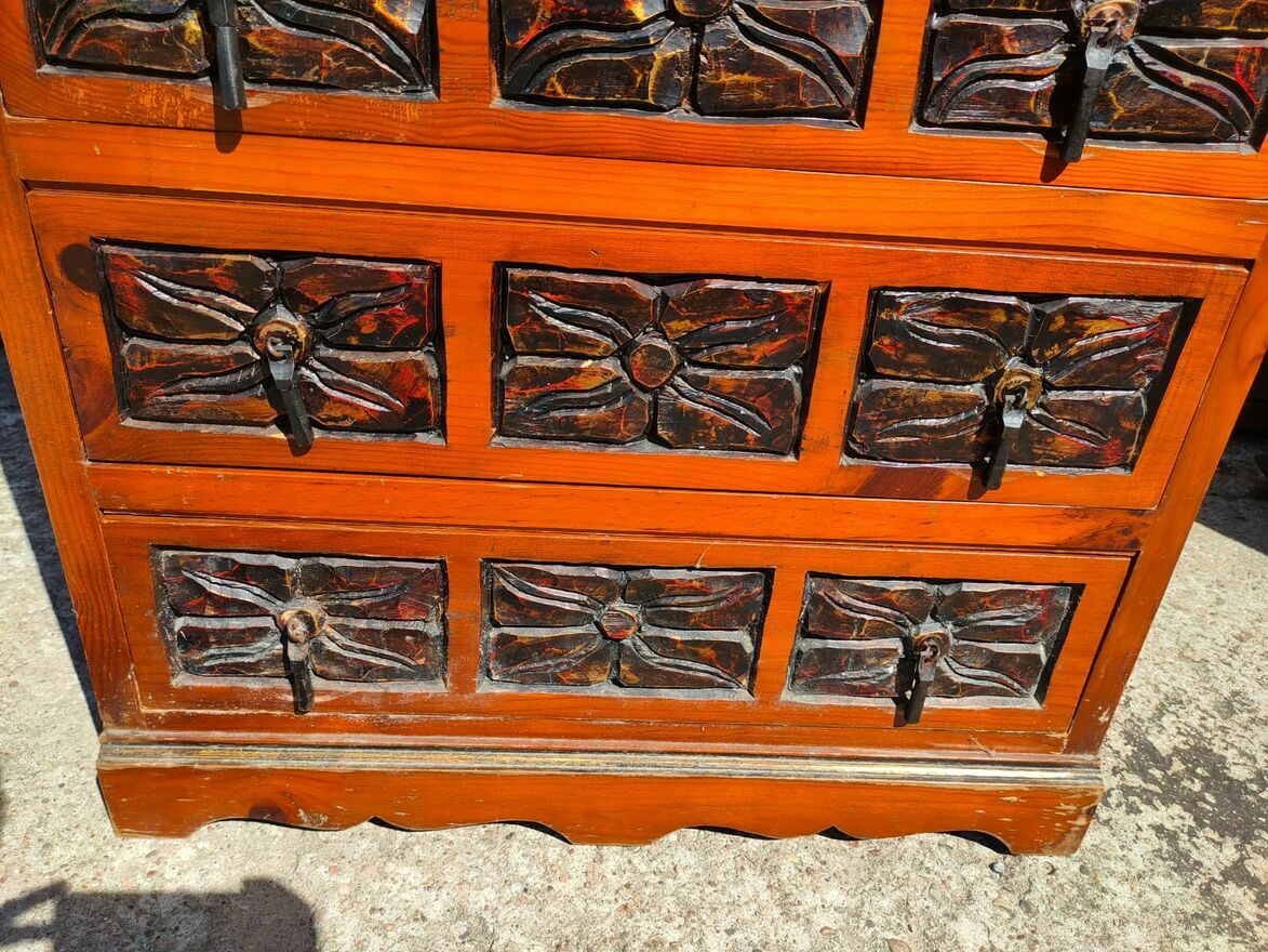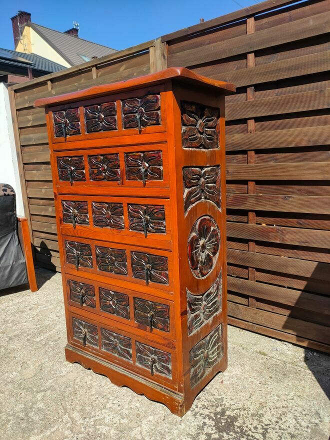 Sprzedam przepiękną, drewnianą komodę wysoką. Ręcznie rzeźbiona. Unikatowa. Posiada uszkodzenie na blacie.Wymiary: