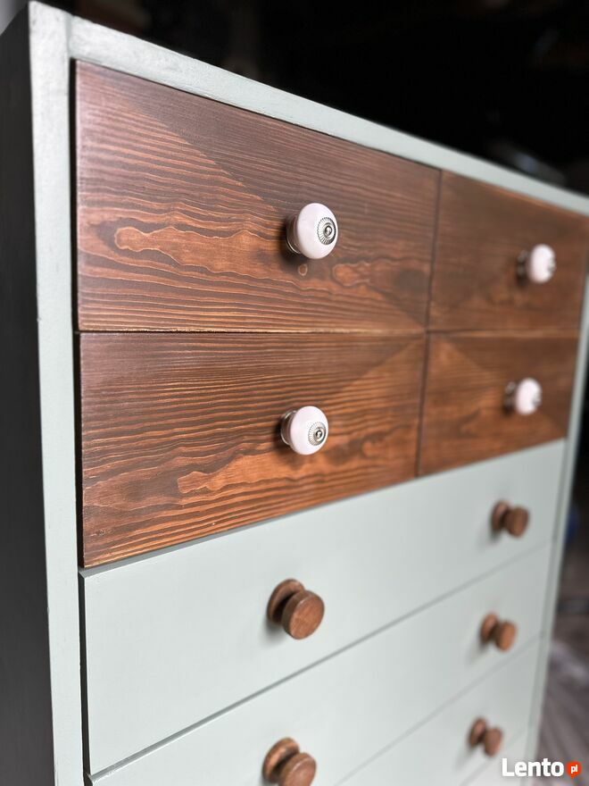 Komoda została odświeżona ręcznie: dolna część pokryta została matową farbą w pistacjowym pastelowym odcieniu, a górne szuflady zachowały naturalny urok drewna, podkreślony ciemniejszą bejcą i lakierem. Gałki w górnych szufladach zostały wymienione. Natomiast dolne szuflady zdobią oryginalne drewniane gałki.