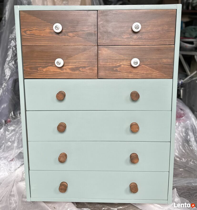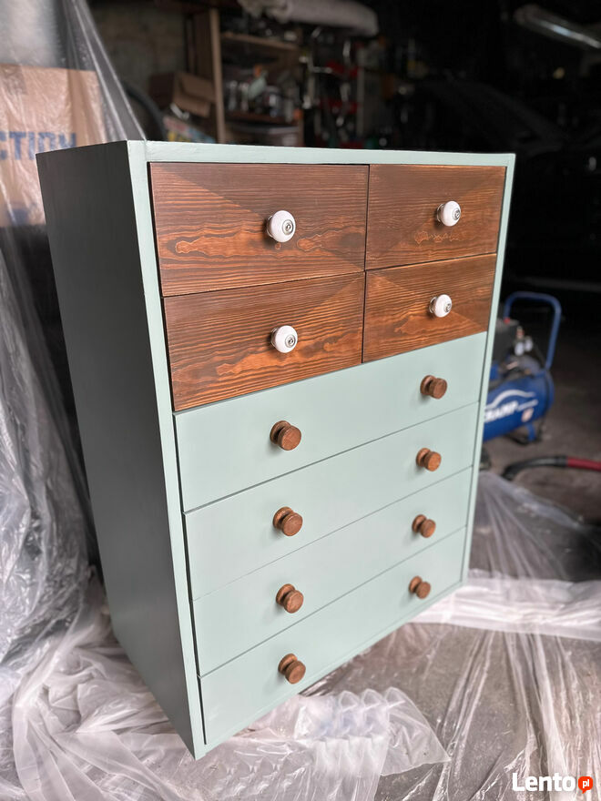 Unikalna komoda PRL po renowacji – styl retro z nowoczesnym twistem.Na sprzedaż wyjątkowa, odnowiona komoda z lat PRL – idealna do wnętrz w stylu vintage, boho, retro czy modern farmhouse. Mebel ma 8 pojemnych szuflad, które pomieszczą naprawdę sporo – od dokumentów po tekstylia.