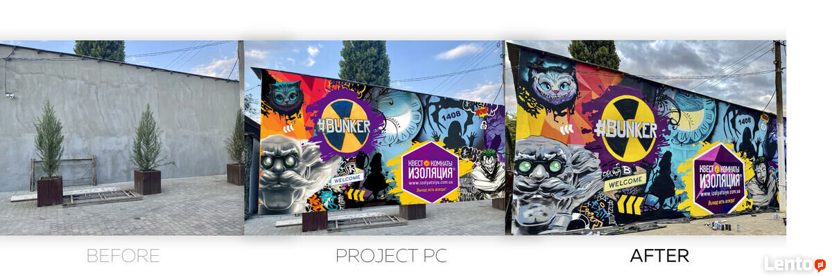Kompleksowe Artystyczne Malowanie MURALE ARTYSTYCZNE / MURALE REKLAMOWE / STREET ART / GRAFIKI ŚCIENNE / BRANDING MIEJSC / IDENTYFIKACJA WIZUALNA / GRAFIKAOferuję kompleksowe dekoracyjne malowanie ścian, pomieszczeń oraz wszelkiego rodzaju innych powierzchni, od początkowego etapu jakim jest projektowanie, zaopatrzenie w odpowiednie materiały / farby, do końcowego etapu jakim jest zadowolenie zleceniodawcy.