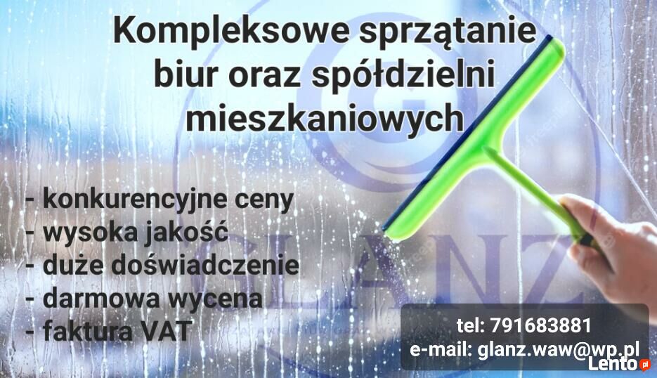 Oferujemy wysokiej jakości usługi sprzątania biur oraz wspólnot mieszkaniowych. Gwarantujemy czystość i porządek, aby Twoje biuro czy wspólnota zawsze prezentowały się doskonale. Zapewniamy kompleksowe sprzątanie, dbamy o szczegóły, by stworzyć idealne warunki dla pracy i życia. Skontaktuj się z nami już dziś, a dostosujemy nasze usługi do Twoich potrzeb!Cena: Wycena indywidualna, dostosowana do rozmiaru i rodzaju pomieszczeń. Zapewniamy konkurencyjne ceny - od 1,5 zł za m2! - oraz wysoką jakość usług.
