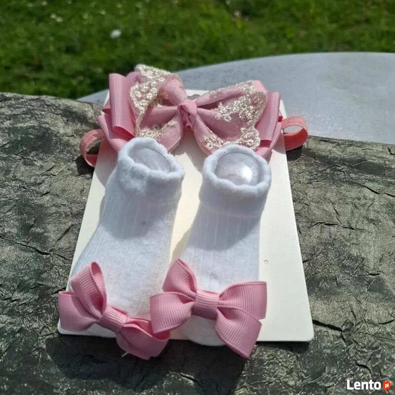 Zestaw stworzony z myślą o pierwszych chwilach życia — delikatna opaska z kokardką i puszyste skarpetki w odcieniu pudrowego różu. Idealny na wyjątkowe okazje, ale równie piękny na co dzień.Stan: nowy, bez metki