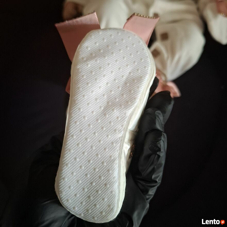 rękawiczki i buciki z ozdobnymi kokardkami i złotymi akcentami