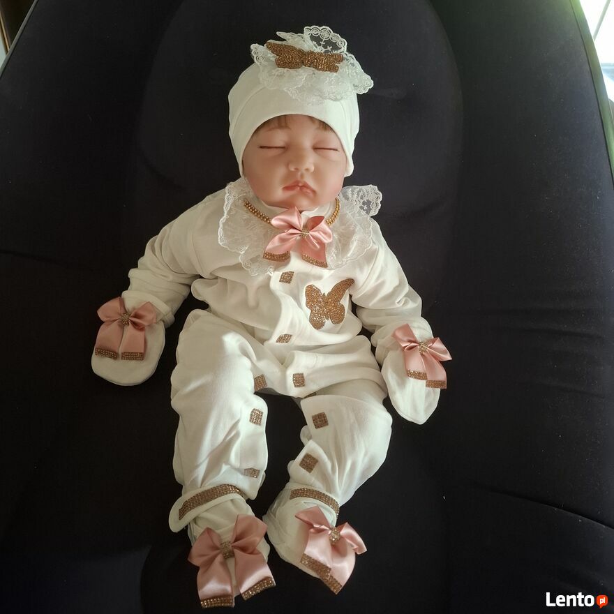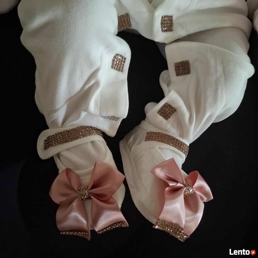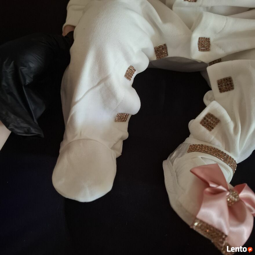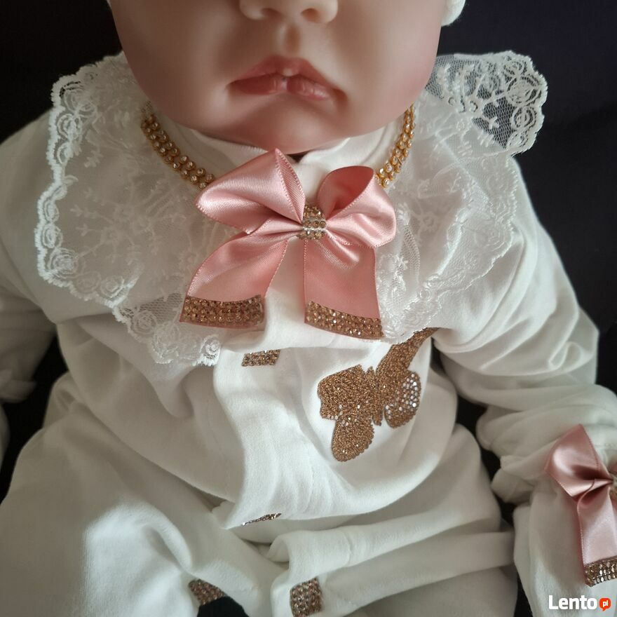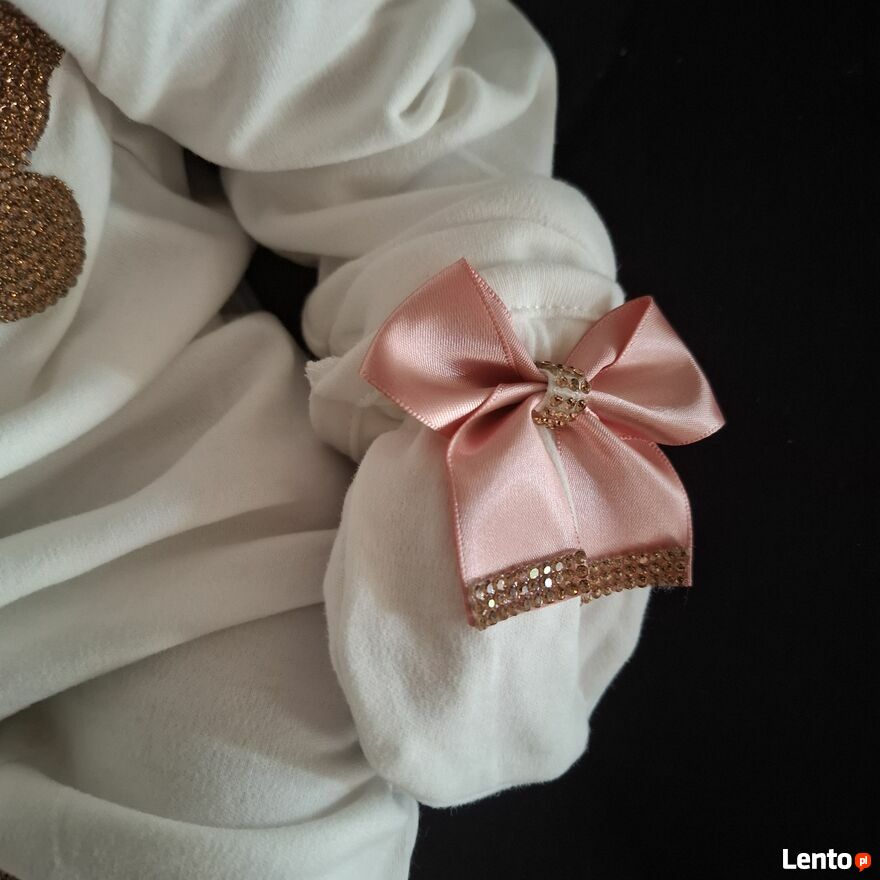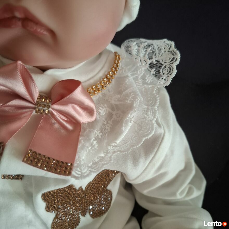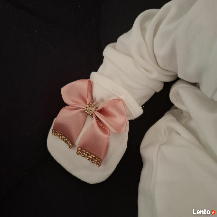 Uroczy komplet dla maluszka w wieku 3–6 miesięcy, idealny na wyjątkowe okazje lub jako prezent W skład zestawu wchodzi: tylko wysyłkabiały pajacyk z błyszczącym złotym motylkiem i różowymi kokardkami