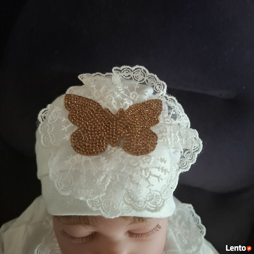 czapeczka z koronkowym wykończeniem i złotą kokardką