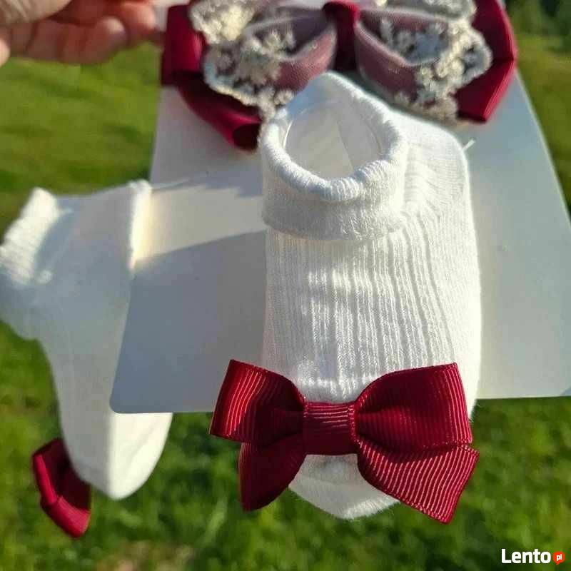 Komplet niemowlęcy – bordowa opaska i białe skarpetki